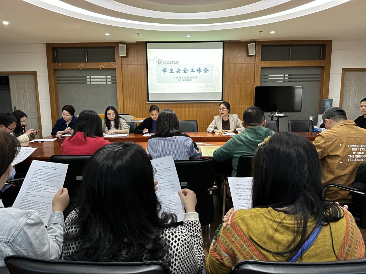 3月19日晚,财政与公共管理学院在逸夫楼923召开学生安全专题工作会,传达了学校安全工作会议精神,对学生安全教育工作进行了布置安排。会议由学院党委副书记王晓芬主持,学院全体辅导员、班主任参会。