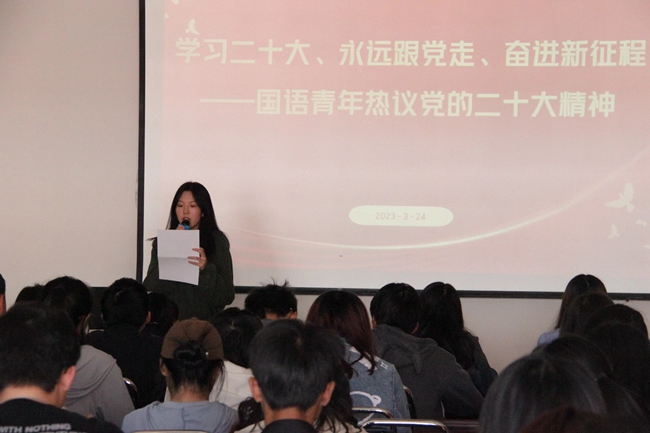 汉语20-1班团支书吴索菲亚同学首先进行了分享。她表达广大青年要团结起来、组织起来,带领周围的同学认真学习党的二十大精神,为实现自身的价值而奋斗。缅语20-1班杨坛同学在分享中提到,我们正处在中华民族伟大复兴的新征程,当以学习为首要任务,深刻领悟党的二十大报告,奋斗在当时,应紧跟时代的步伐,努力成为国家的有用之才,栋梁之才。来自越语21-1班的周迪曼表示广大青年要坚定不移听党话,跟党走,树立为祖国、为人民奋斗的坚定理想,树立回报祖国的决心和信心,勇敢走在时代的前列,做时代的开创者、奋斗者、奉献者。英语21-1班白雪在分享中谈到作为新青年,要提高政治站位,拥有昂扬奋斗的精神,做有担当的青年。最后,新生团干乔一鸣通过讲述自己学习党的二十大精神的心得体会,表示大家勤奋学习,苦练本领,筑牢听党话,跟党走的思想根基。学院团委老师马婧在总结中谈到,青年的成长与祖国的发展紧密相连,同时她号召团干带领广大青年深入学习贯彻宣传党的二十大精神,争做堪当民族复兴大任的新青年。