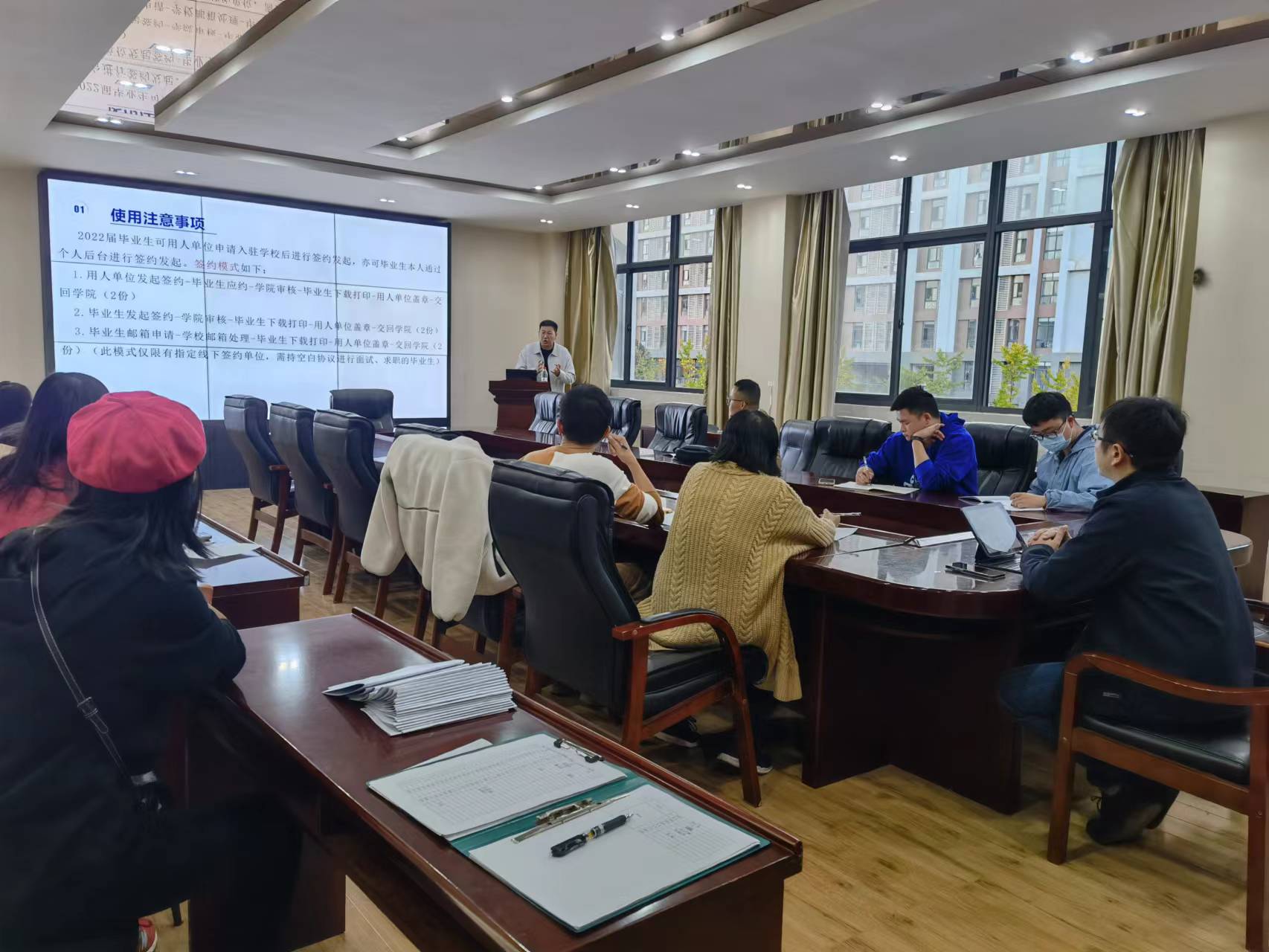 11月20日晚,统计与数学学院召开2023届毕业班班主任专题会议暨“云就业”平台培训会。会议邀请了学校招生与职业发展中心张志超老师就“云就业”平台使用进行培训,学院学生管理科科长刘建琳,研究生管理科科长曾丽萍,辅导员阮娅丽、苏翔,学生管理科教师蔡成及2023届本硕毕业班班主任参会。会议由学院党委副书记石晓晶主持。