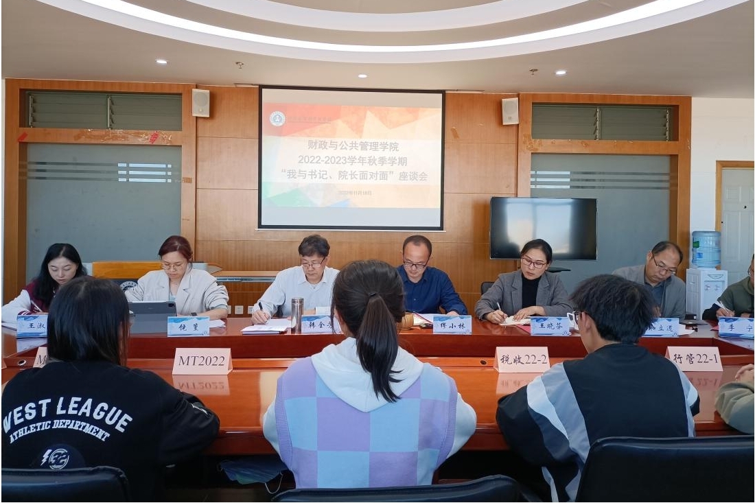 11月18日下午,财政与公共管理学院在南院逸夫楼923开展“我与书记、院长面对面”座谈会。学院院长缪小林,副院长韩全芳、和立道,第七届学生会、研究生会委员代表及2022级各班班长参加座谈,会议由党委副书记王晓芬主持。