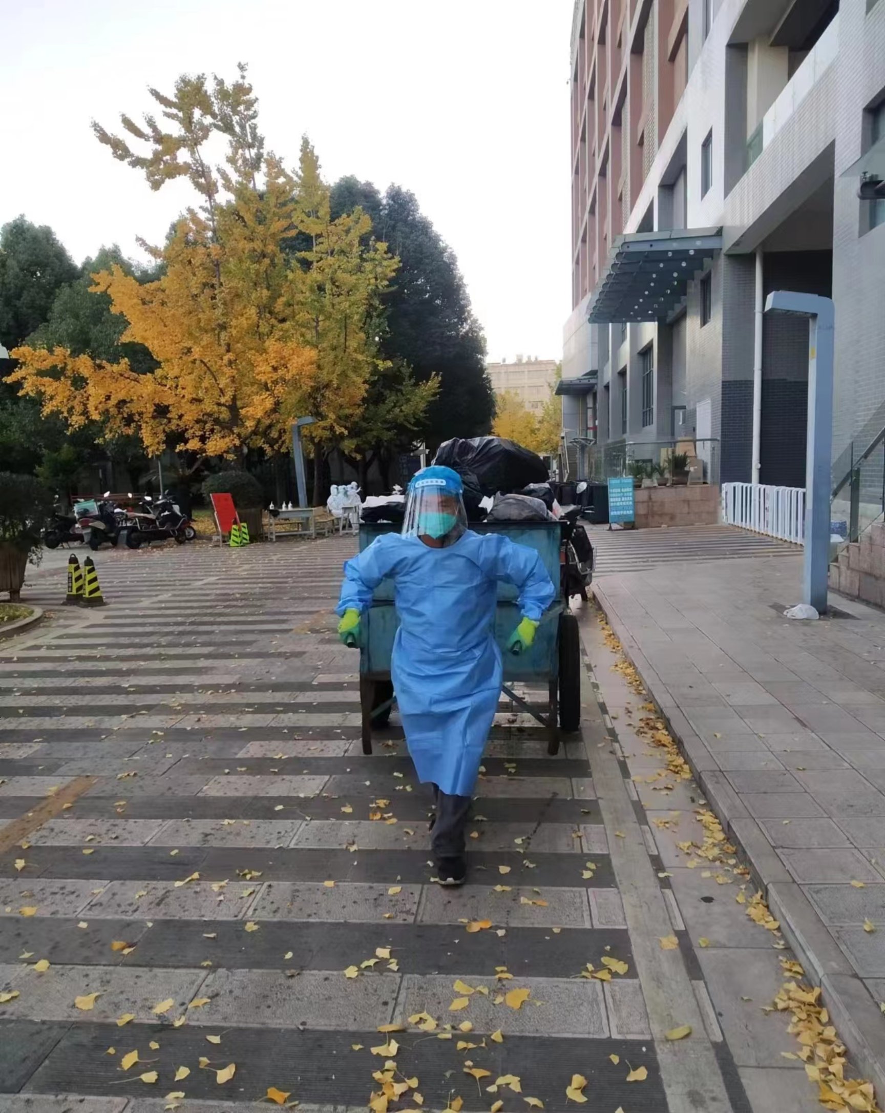 驻守北院的37名职工穿着防护服忙碌在一线,他们进入封控公寓开展卫生保洁和消毒,及时转运各楼栋垃圾,并完成指挥部临时安排的其他工作任务。