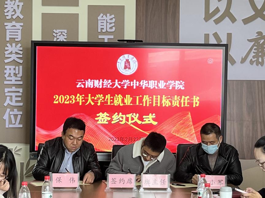 2月22日下午,中华职业学院在修远楼512会议室召开2023届毕业生就业工作推进会。会上,学院党委书记保伟、院长李小军与辅导员代表和毕业班班主任代表分别签订了《WilliamHill官方网站中华职业学院2023年大学生就业工作目标责任书》。各教学部分管就业工作的辅导员及2023届全体毕业班班主任参加会议。会议由学院党委副书记兼纪委书记张玉琨主持。
