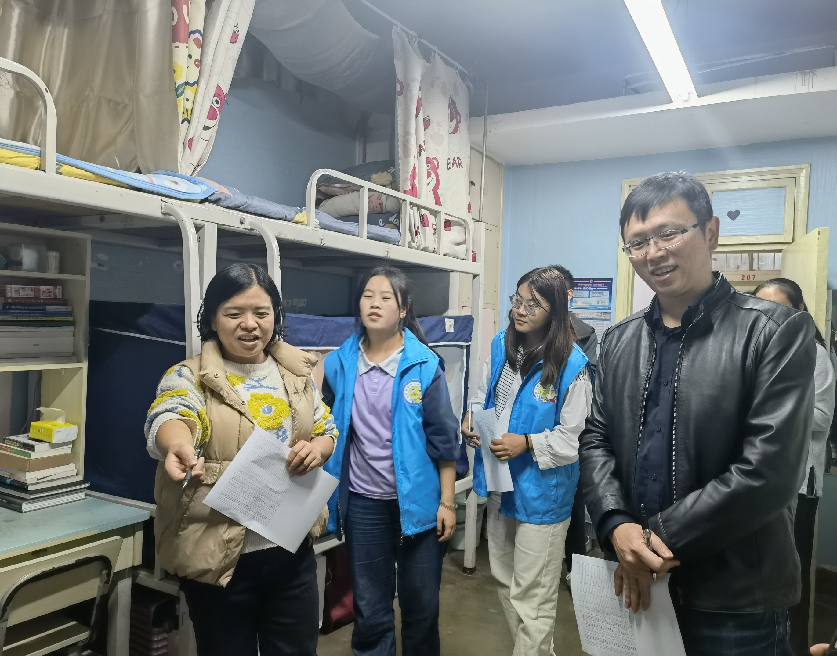 为教育引导学生共同完成宿舍内务卫生清洁、氛围创造和宿舍文化建设,营造一个舒适温馨的宿舍环境,11月8日下午,统计与数学学院党委副书记石晓晶,学生管理科科长刘建琳,辅导员阮娅丽、苏翔,学生管理科教师蔡成、学生自律委员会骨干到学院学生宿舍进行“文明宿舍”创建评比评分和宿舍安全检查。
