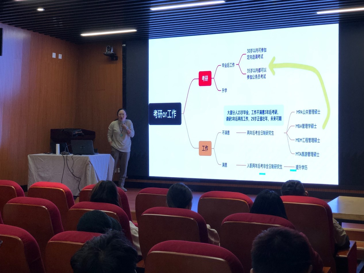 王彬从同学的就业观开始分析,鼓励学生先就业再择业。针对学生的需求,她依次分析了公务员、事业单位、军队文职、国有企业四种公职类单位就业的优劣势,同时强调要合理规划就业,明确考试时间、考试内容及考试要求。她建议大家“精准规划、提早准备、逢考必报”。