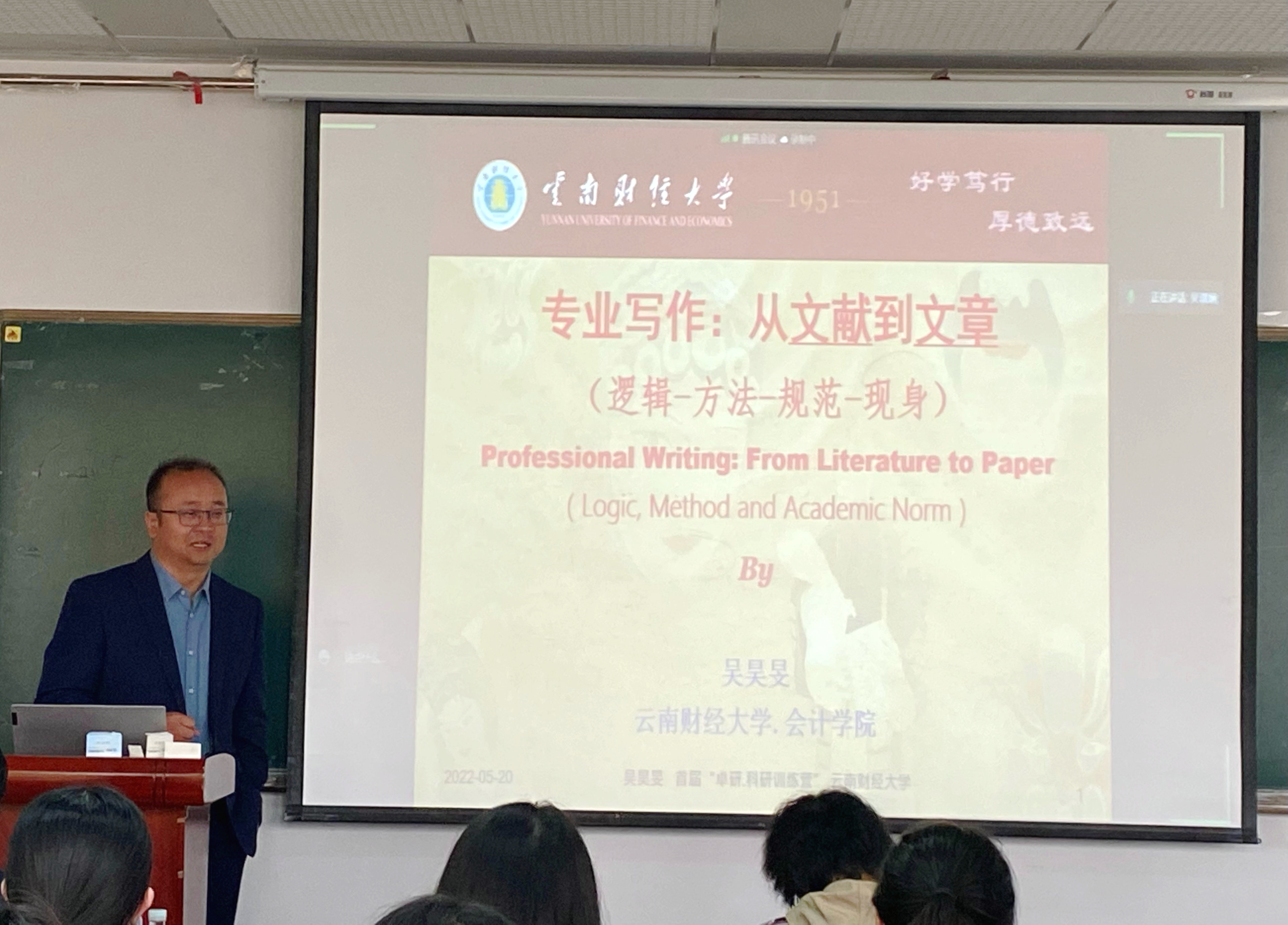开班仪式结束后举行了首场培训会。吴昊旻以“专业写作:从文献到文章”为主题,通过实证文章的“两大依据、三个主体”以及学位论文考核的“三个重点”讲解了文献综述的重要性,并以个人实际研究过程举例说明和理论解读,系统讲述了“学术研究”“思维训练”“写作训练”三个论文写作的研究进程。他指出,学术研究是从思维训练起步,而思维训练是从写作训练起步,写作训练是从前人之肩起步,本硕博学生的根本区别在于知识逻辑的分布形态,是从零散的知识构建系统化的知识,进而创造性地架构一个全新知识体系的过程。