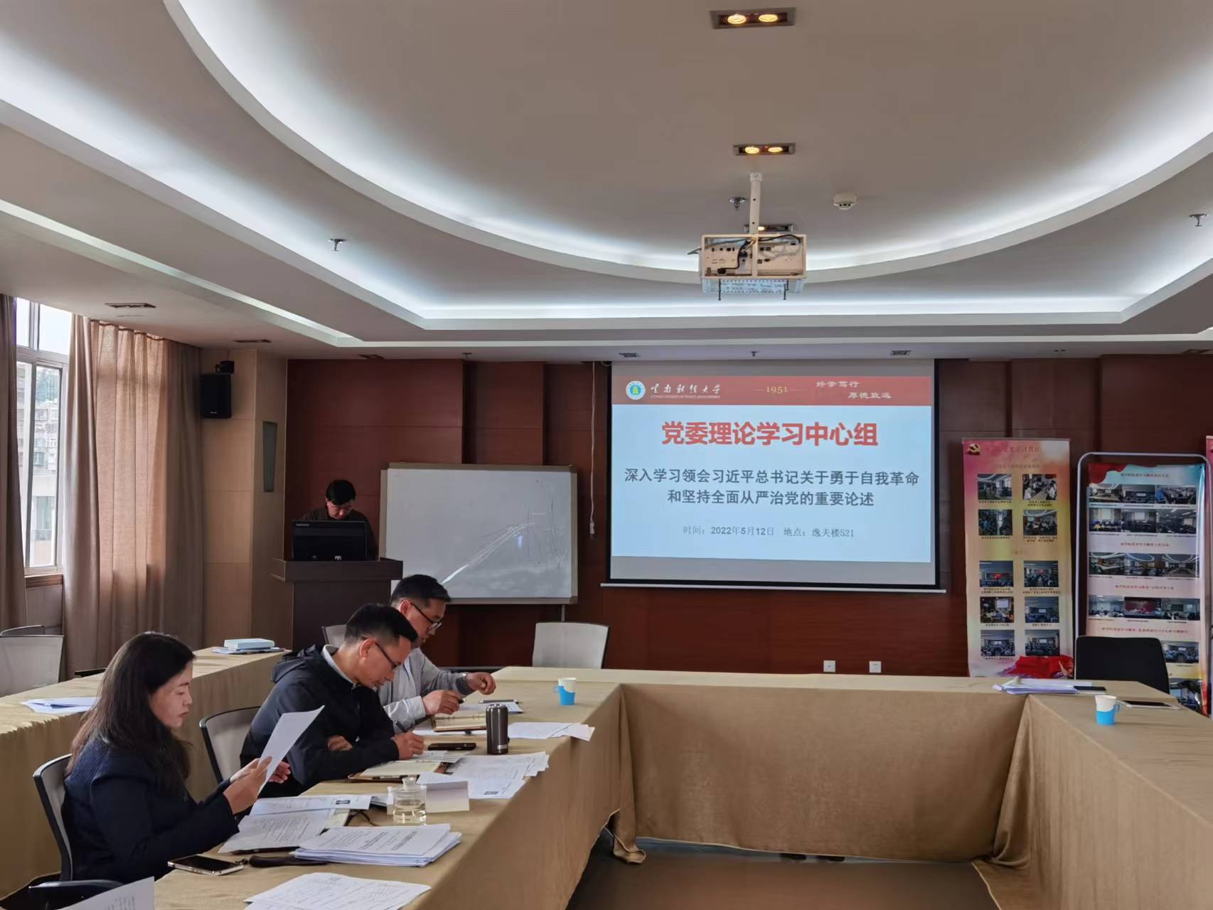 5月12日上午,商学院党委理论中心组在南院逸夫楼521会议室开展专题学习,深入学习领会习近平总书记关于勇于自我革命和坚持全面从严治党的重要论述。专题学习由学院党委书记王敏领学,院长卢启程主持。