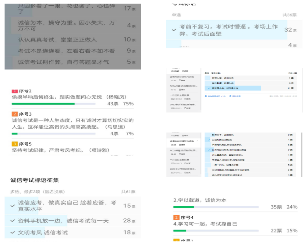 各班团支书选出班级最佳诚信标语,并组织开展考风考纪和诚信考试专题教育主题团日活动、开展校纪校规专题学习、进行严肃考纪诚信应考专题学习讨论等一系列活动,让每一位学生树立诚实考试、抵制作弊的思想观念,以正确的态度和充分的复习准备来迎接期末考试。