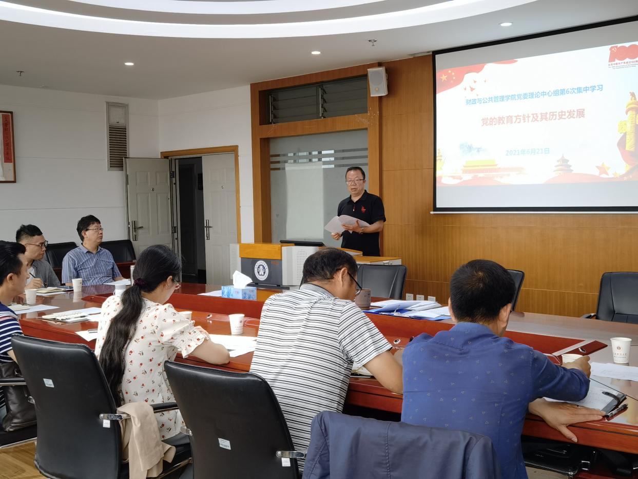 6月21日上午,财政与公共管理学院开展党委理论中心组扩大会第六次专题学习暨教职工理论专题学习,主题是深入学习领会党的教育方针,学院党委书记朱文领学,中心组成员、各科室负责人及各党支部书记参加学习。