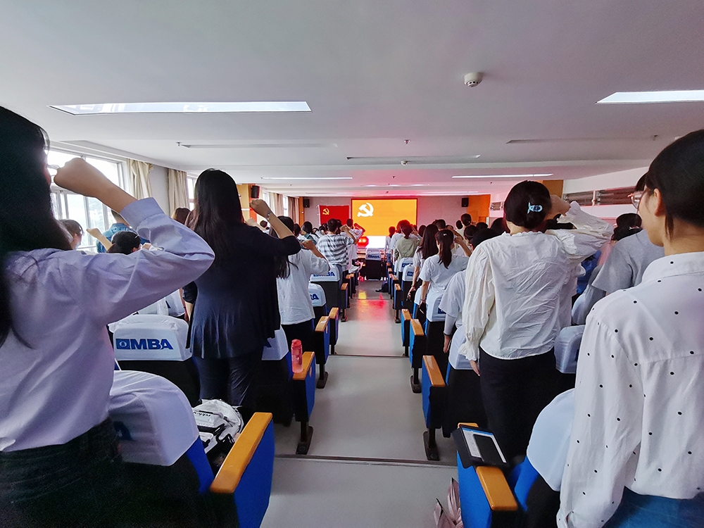 大会在庄严的国歌声中拉开序幕。学院党委委员朱次毅宣读新接收党员的名单,王敏带领 55名新发展党员面向党旗进行宣誓,老党员重温入党誓词,新党员代表杨晓倩发言。