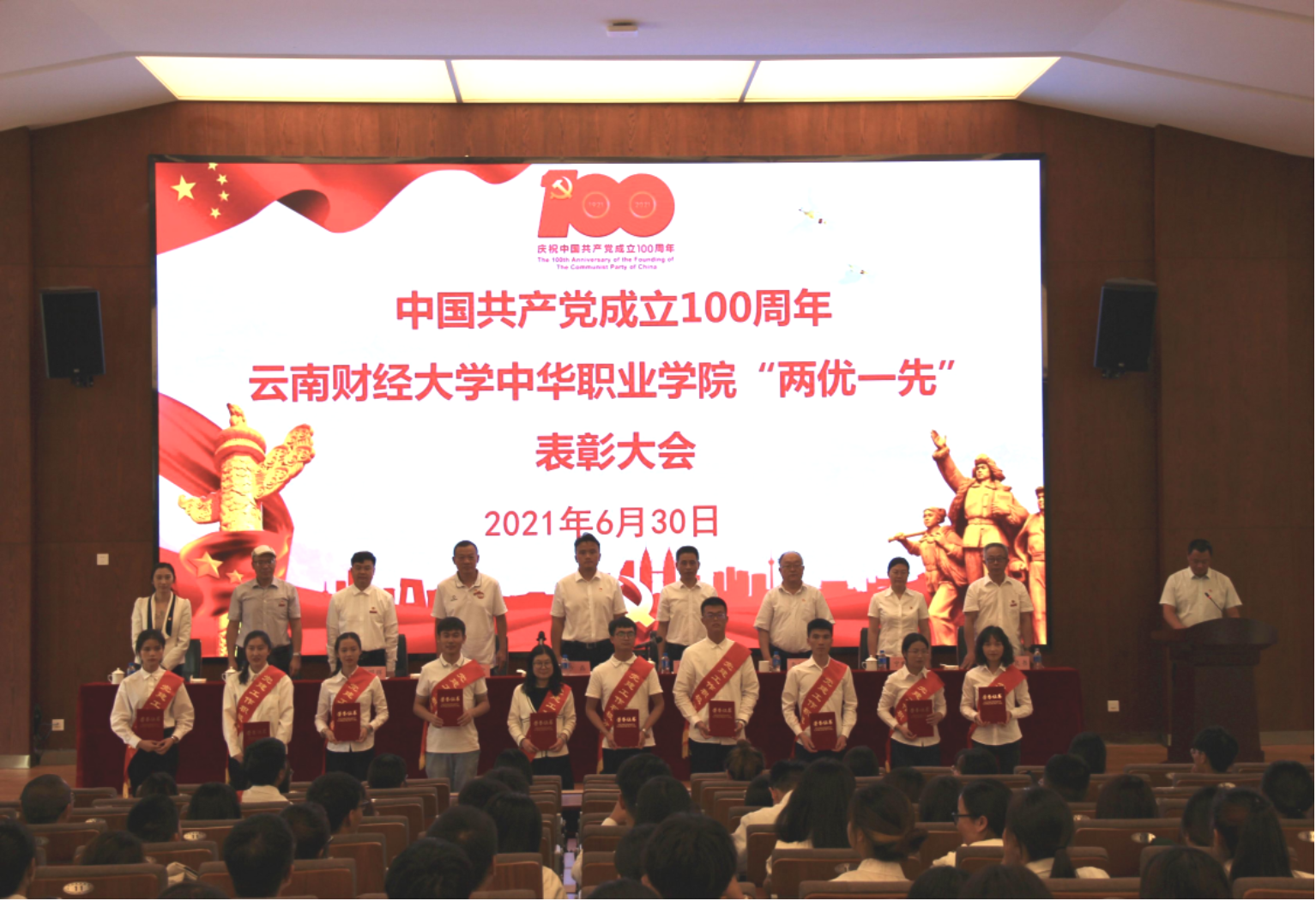 6月30日,庆祝中国共产党成立100周年中华职业学院“两优一先”表彰大会在安宁校区鹏云楼一栋报告厅举行。学院党政领导班子、各党支部书记、师生党员代表、2021年上半年入党的新党员代表等共计300余人参加大会,会议由中华职业学院院长李小军主持。