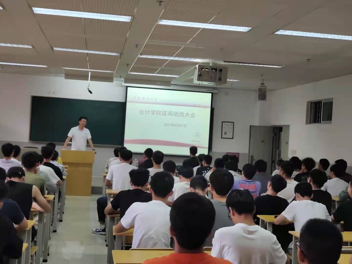 5月21日,会计学院在逸夫楼211举办2021年秋季征兵动员大会。武装部国防科科长冯勇,学院党委书记徐良金、党委副书记兼纪委书记王涛,各班辅导员、班主任及有入伍意向的学生参加,会议由王涛主持。