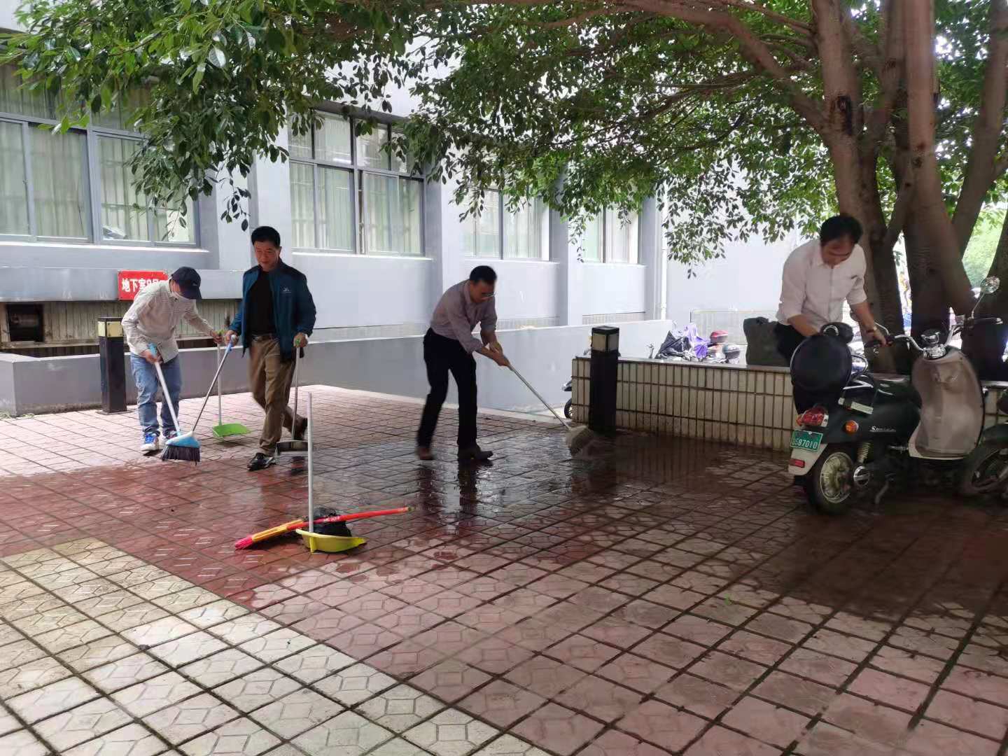为清洁校园环境卫生,及时处理校园安全隐患,近日,旅游与酒店管理学院教工二支部党员晏雄、李永祥、赵顺顶、班先海,组织员杨倩等同志,对北院卓远楼周边环境展开了清洁和打扫。