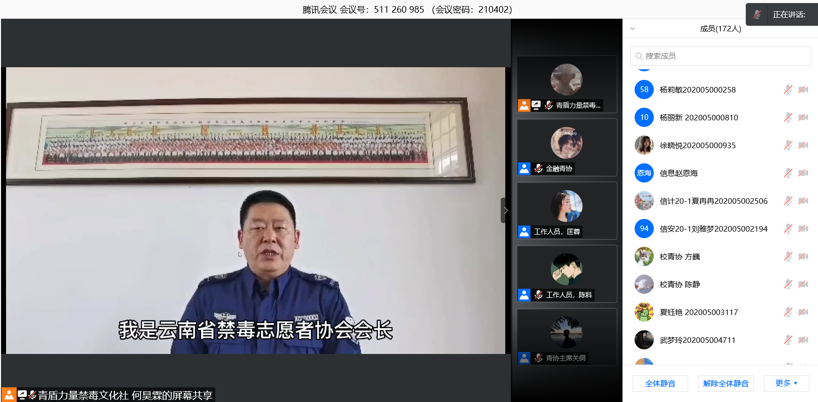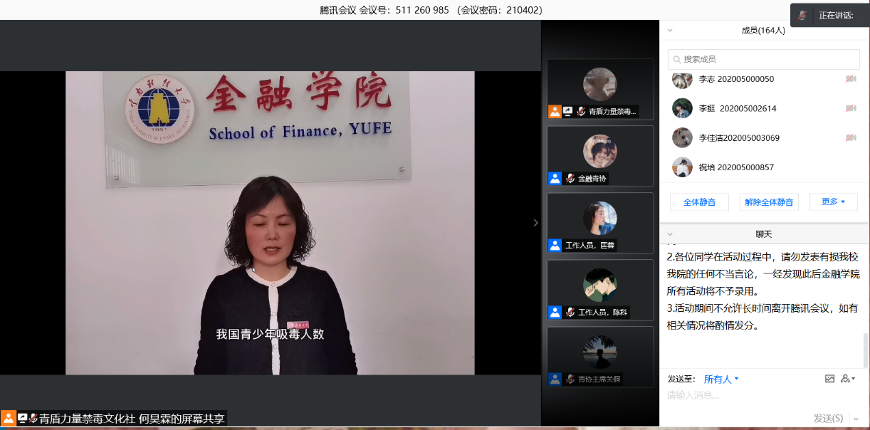 为进一步推进“6·27”青少年毒品预防教育工程,加大校园禁毒宣传力度,为青少年学生普及毒品和艾滋病防治知识,增强青少年学生的自我保护意识,筑牢校园拒毒防艾防线,4月2日下午15时,金融学院团委于腾讯会议召开第六届“青盾力量禁毒防艾”系列活动开幕式。云南省禁毒志愿者协会会长束佳骏先生、金融学院党委副书记汪薇萍老师、金融学院团委书记任琳老师、昆明理工大学青年志愿者联合会代表、WilliamHill官方网站十六家青年志愿者协会代表及十一家社团代表出席了本次开幕式。