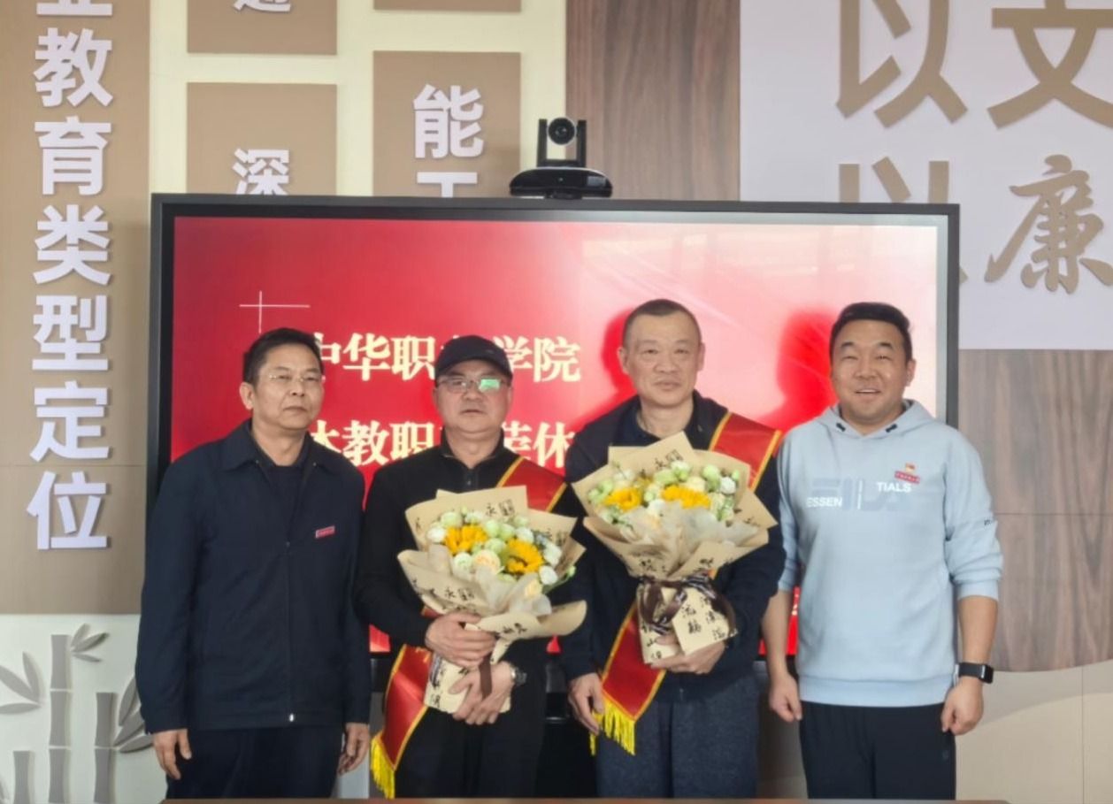 3月27日下午,中华职业学院分工会在安宁校区修远楼512会议室为退休教师陆宁、段洪举办退休教职工荣休会。学院党政领导班子成员、院属各部门(教学部)负责人、学院分工会委员以及教职工代表参加欢送会。会议由分工会主席刘诗奇主持。