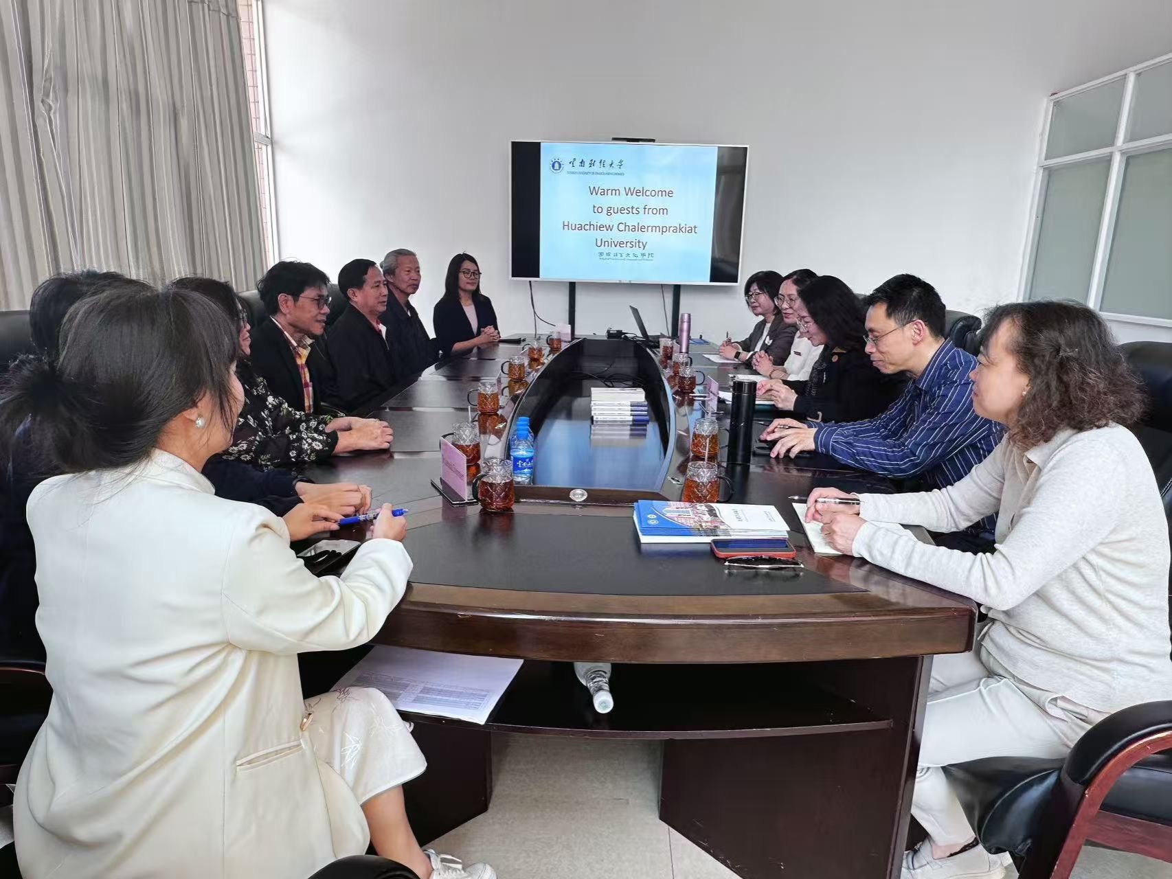 4月11日,泰国华侨崇圣大学代表团Jansuda Chaiprasert博士一行10人到访国际语言文化学院,院长刘代容会见来宾并举行座谈。