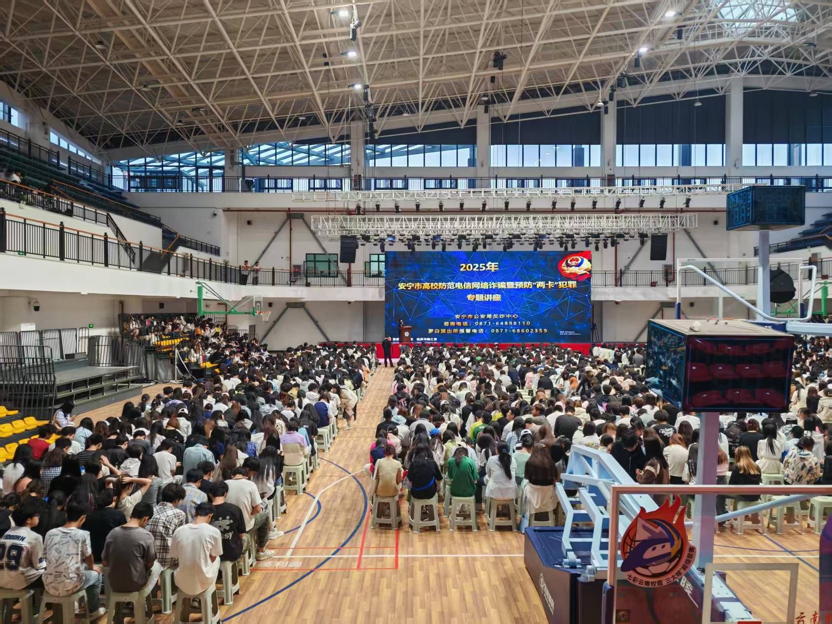 为增强学生防范电信网络诈骗意识,筑牢校园安全防线,4月26日晚,中华职业学院在安宁校区体育馆启动“反诈防骗 从我做起”防范电信网络诈骗专题教育月活动。安宁市反诈中心王玉珠警官、罗白派出所金兆荣警官应邀担任主讲,学院2600余名师生参加。讲座由学院党委书记李丽忠主持。