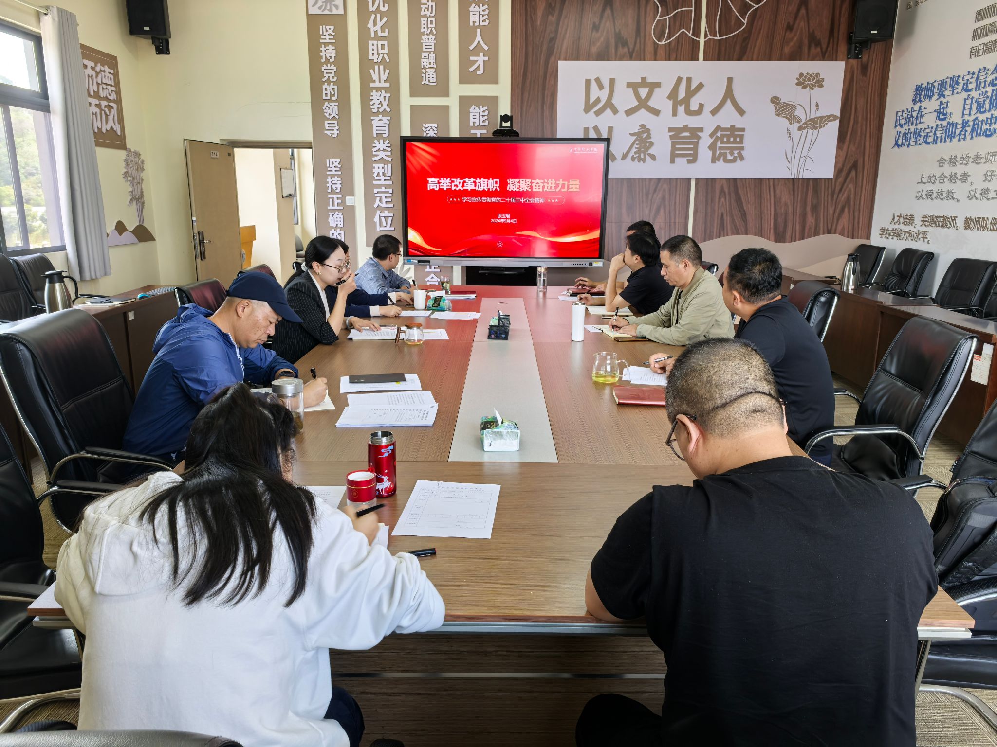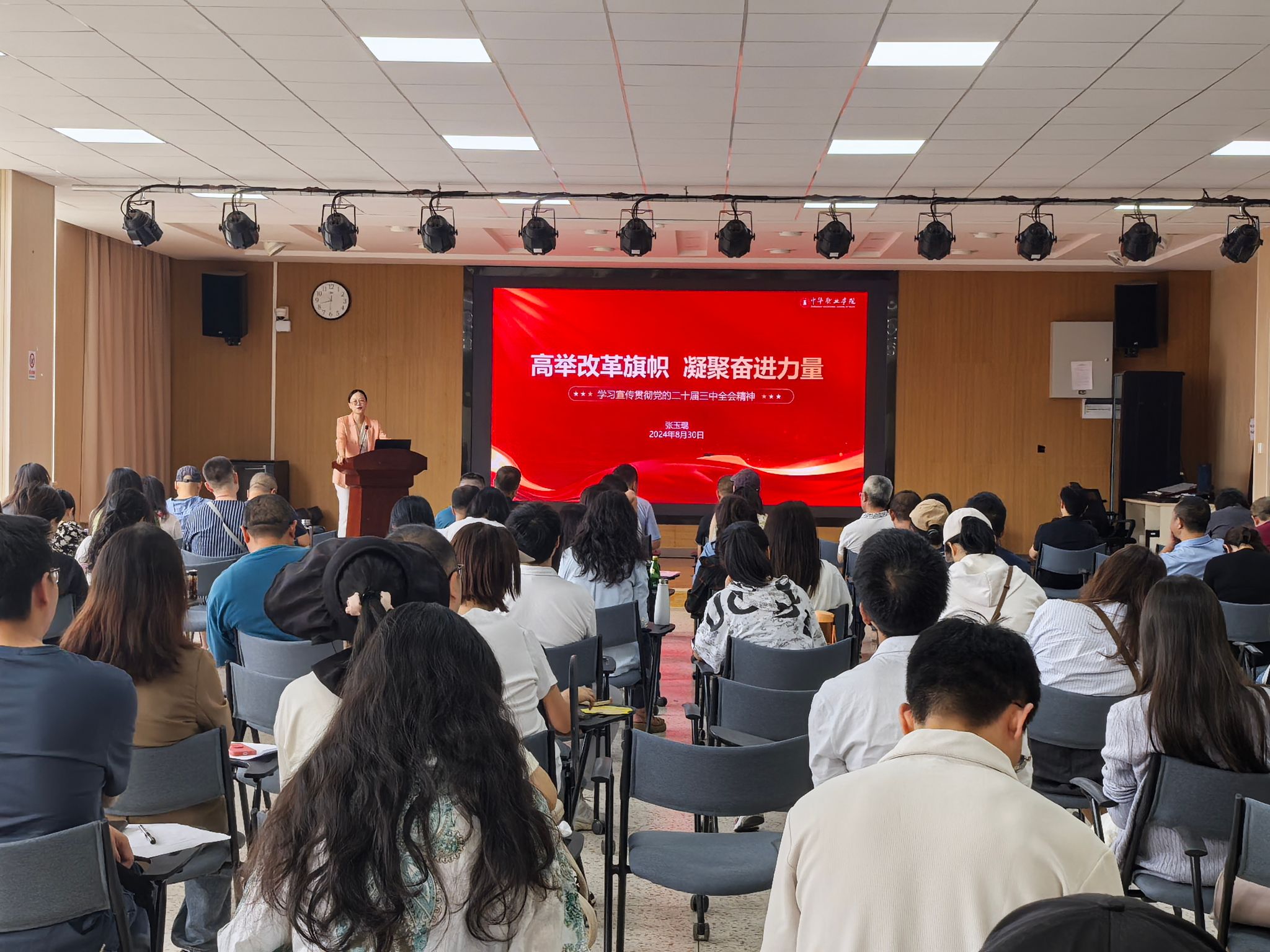 为推动广大教职工、党员干部深入学习贯彻党的二十届三中全会精神,充分认识全会的重大意义,扎实推动全会精神在自身岗位的落实落地,近日,中华职业学院通过党委理论学习中心组、教职工大会、党支部会议等形式聚焦学习党的二十届三中全会精神,开展新学期“理论学习第一课”。