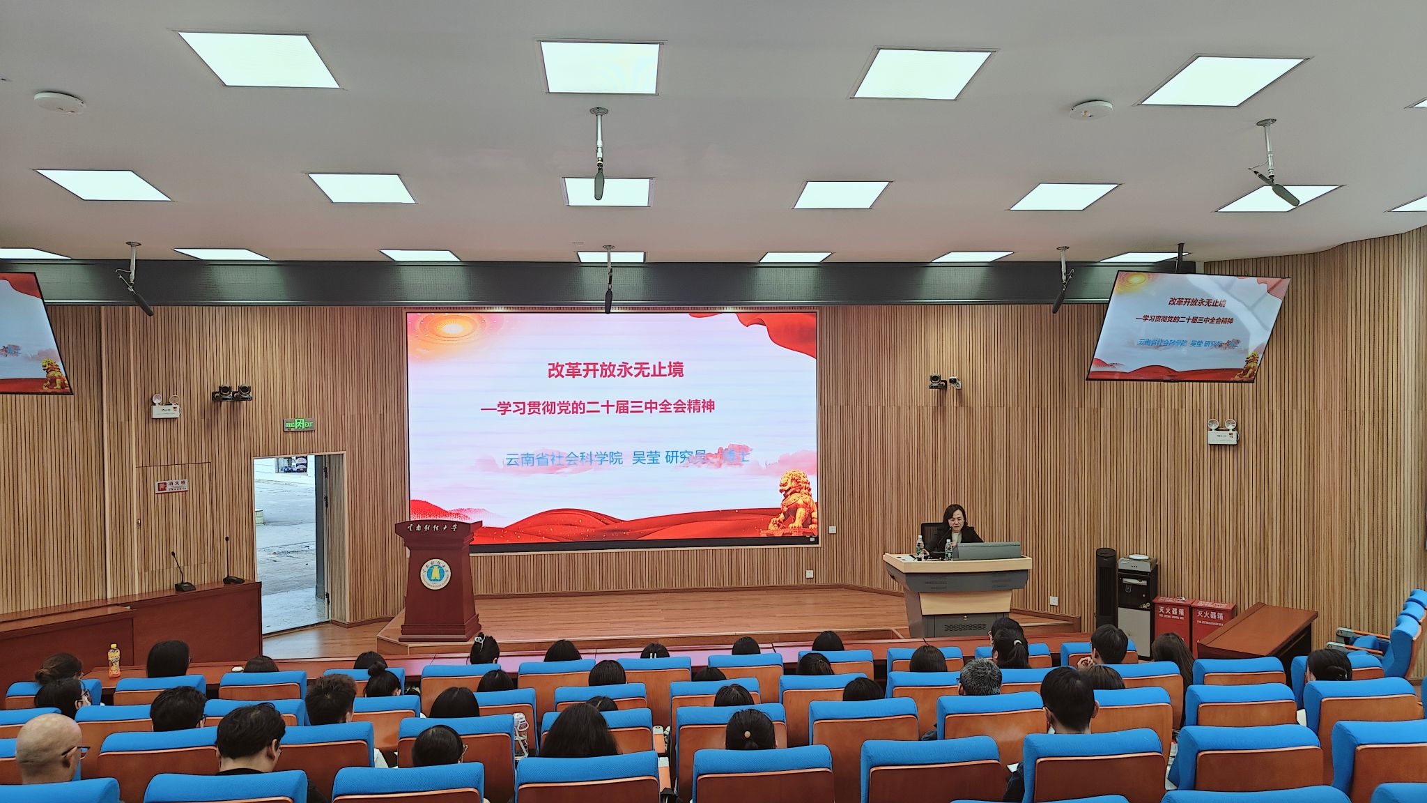 10月25日,2024年云岭大讲堂(云财讲坛)举行讲座,云南省社会科学院马克思主义研究院院长吴莹研究员应邀主讲《将改革进行到底——学习贯彻党的二十届三中全会精神》。讲座由科学技术处与国际语言文化学院联合主办,国际语言文化学院党委副书记俞虹主持,100余名师生党员代表参加讲座。