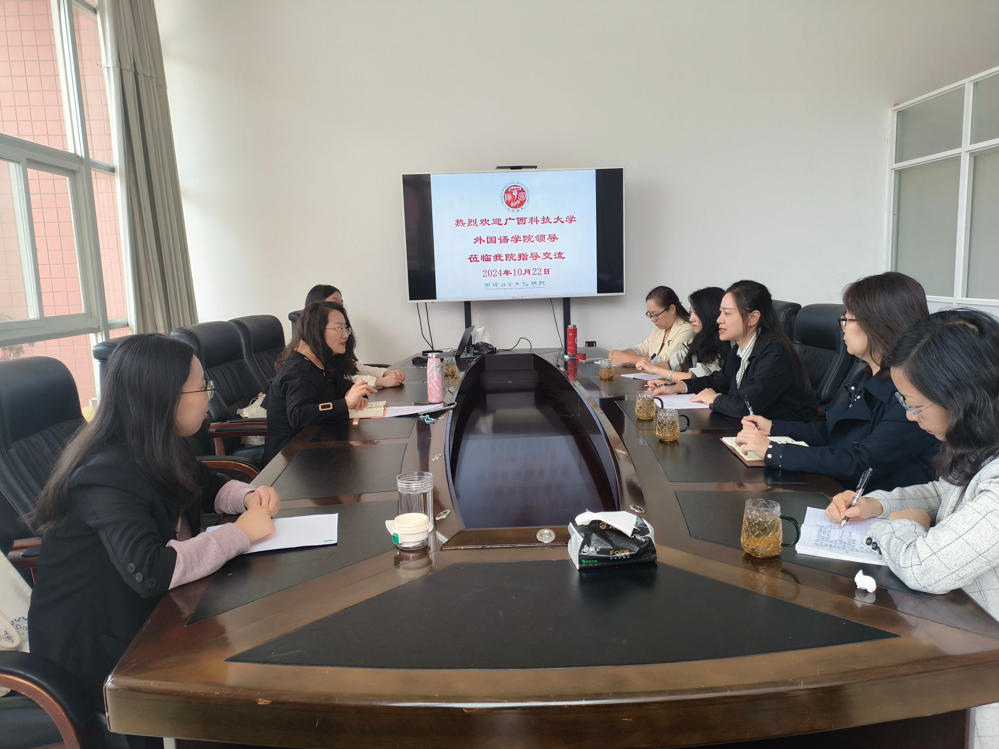 刘代容对广西科技大学外国语学院表示欢迎,简要介绍了学院的基本情况,交流了学院近年来在强化英语专业建设、提升公共外语教学质量等方面的举措和取得的成效。谭玮介绍了广西科技大学的外语教学现状、教学理念、特色及教学成果,期待今后双方在学科发展和课程质量提升等方面互学互鉴。