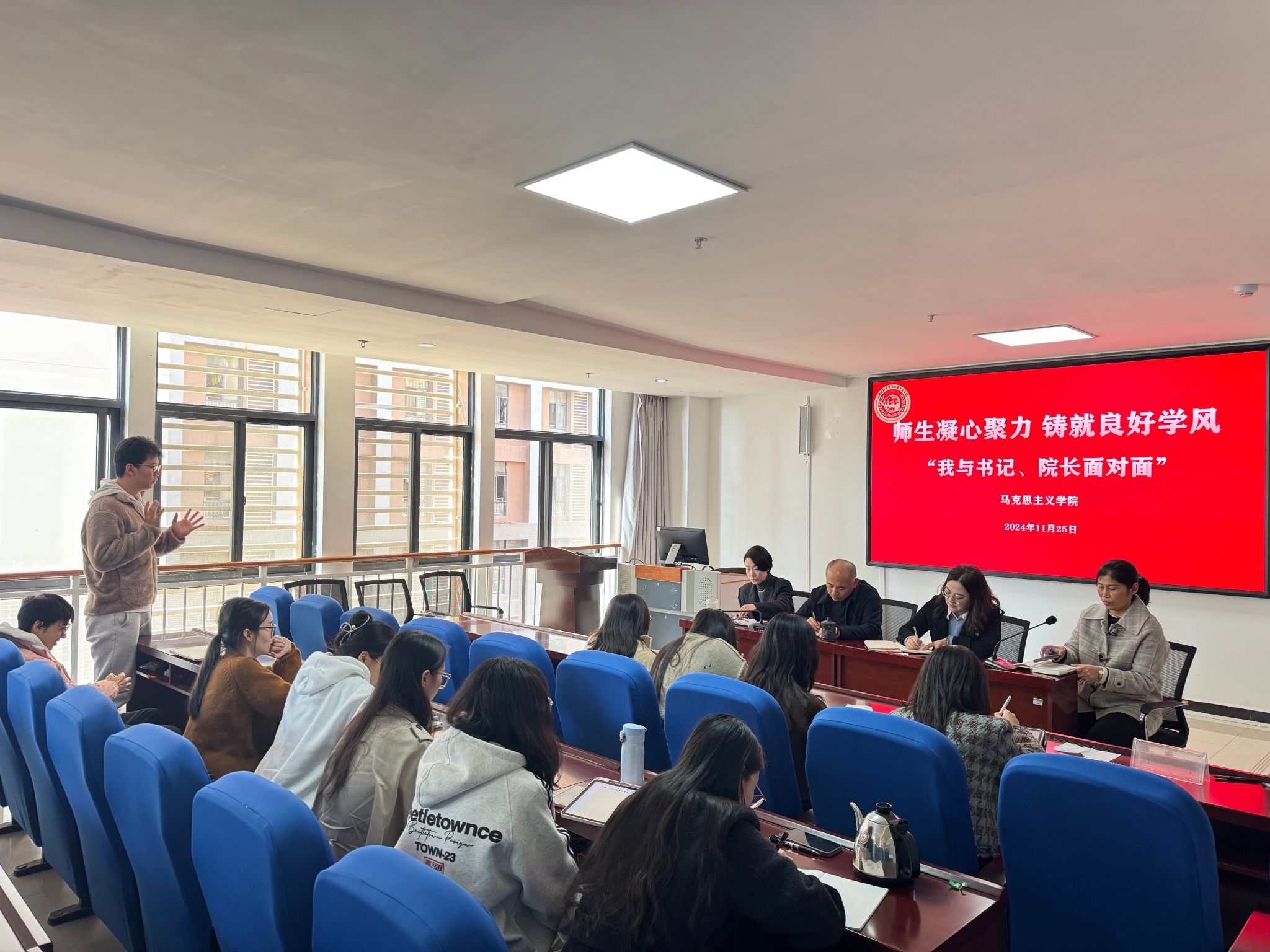 为全面学习和贯彻落实党的二十大精神,进一步畅通学院与学生沟通渠道,倾听学生诉求,强化学生思想政治引领,11月24日下午,马克思主义学院在英华苑416召开“师生凝心聚力 铸就良好学风——‘我与书记、院长面对面’”师生座谈会。学院党委书记曾蕾,院长宁乐锋,党委副书记赵小玎,副院长李贞与全体同学参加。