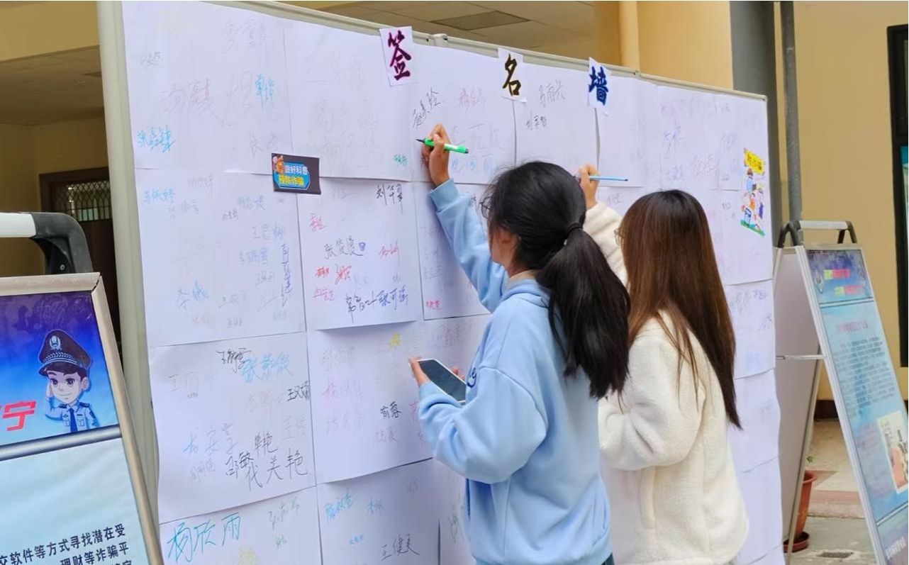 活动由防诈反诈主题墙绘制、“万人签名”墙及下载并学习国家反诈中心APP三部分组成。在防诈反诈主题墙绘制现场,同学们积极围绕“防诈反诈”主题,利用彩色贴纸、马克笔、便利贴等工具参与主题墙的创作与绘制,展示反诈口号、反诈标识、反诈感悟等内容。在“防诈反诈‘万人签名’主题墙”环节,参与的同学排起长队,在学习防诈反诈知识后用彩笔在签名墙上签下自己的姓名,以此表达自己对防诈反诈的决心。志愿者向同学们普及了下载国家反诈中心APP的重要性,讲解了APP的功能应用,帮助同学们加强个人财产安全防护。