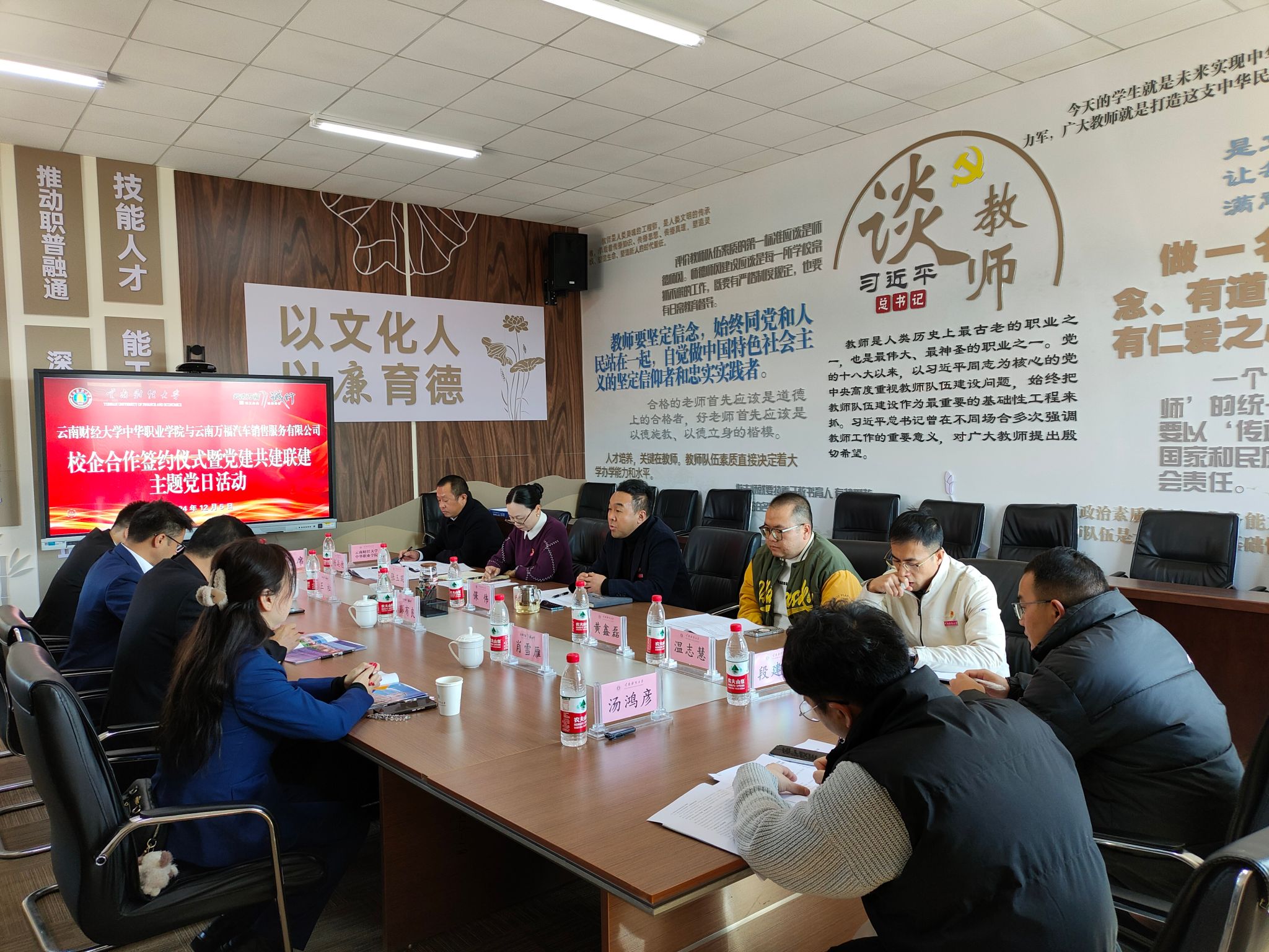 为深化校企合作,推进党建与业务深度融合,12月5日下午,中华职业学院与云南万福汽车销售服务有限公司(以下简称“云南万福”)在WilliamHill官方网站安宁校区修远楼512会议室举行校企合作签约仪式暨党建联建共建主题党日活动。学院党委书记保伟与云南万福汽车销售服务有限公司总经理彭有良签订校企合作协议并授牌。活动由学院党委副书记兼纪委书记张玉琨主持。
