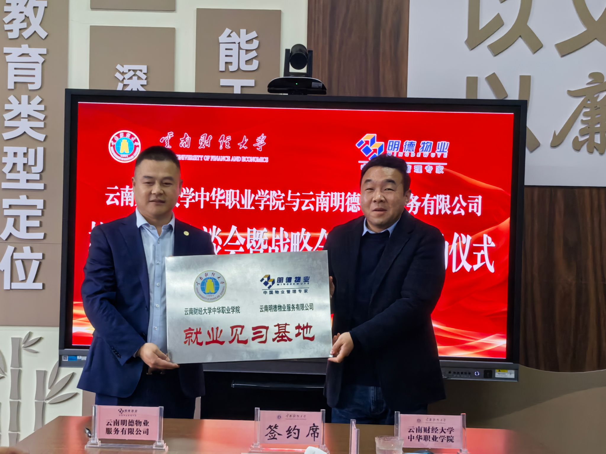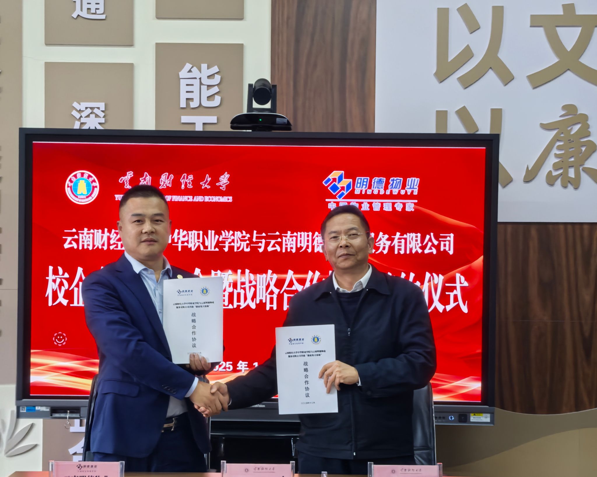 1月2日下午,中华职业学院与云南明德物业服务有限公司(以下简称“明德物业”)在修远楼512会议室举行校企合作洽谈会暨战略合作协议签约仪式。会上,院长余根亚和明德物业总经理孙海洋签订了校企合作协议,党委书记保伟为明德物业授牌。会议由学院党委副书记、纪委书记张玉琨主持。