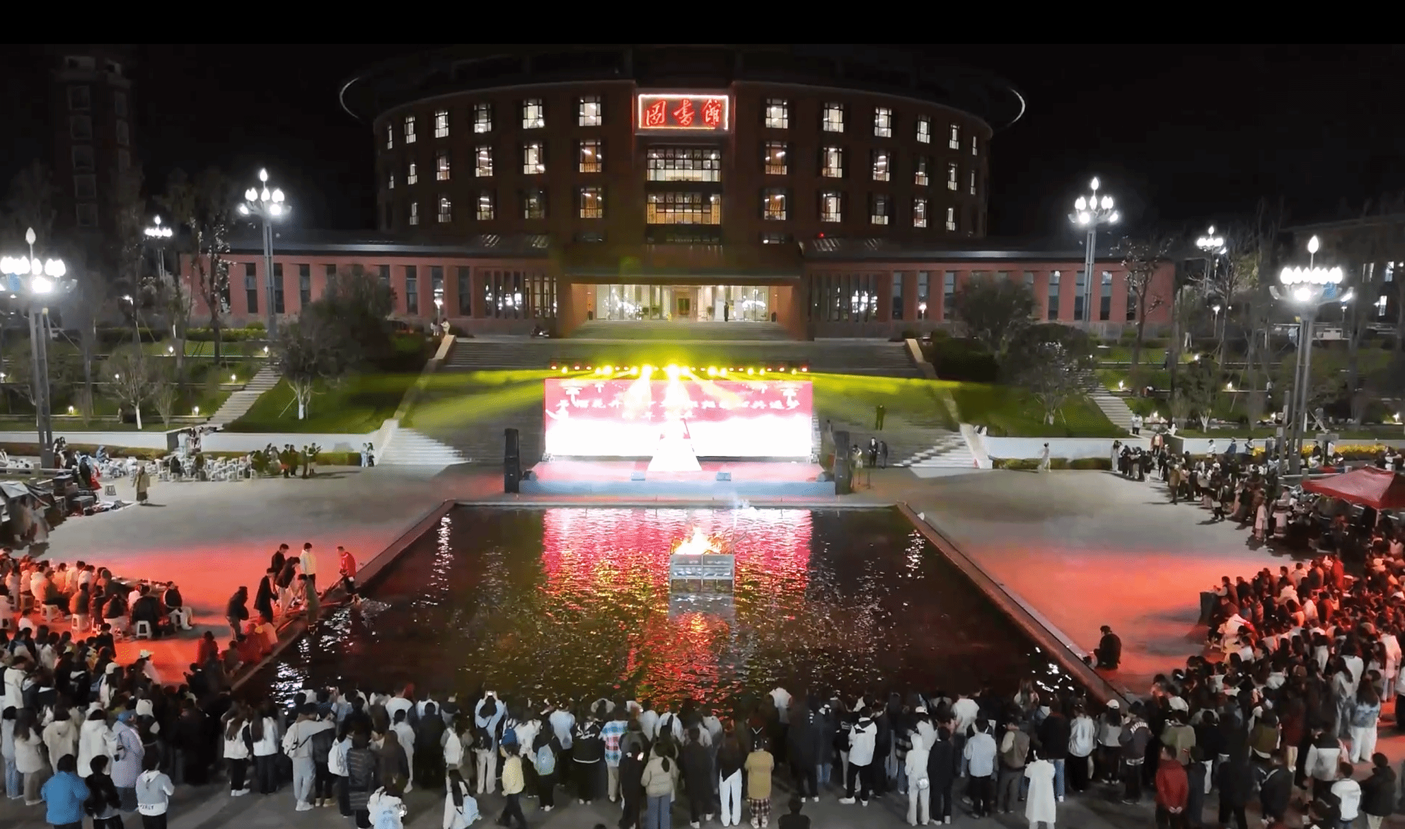 表演落幕,师生们自发围聚篝火,手拉手载歌载舞。