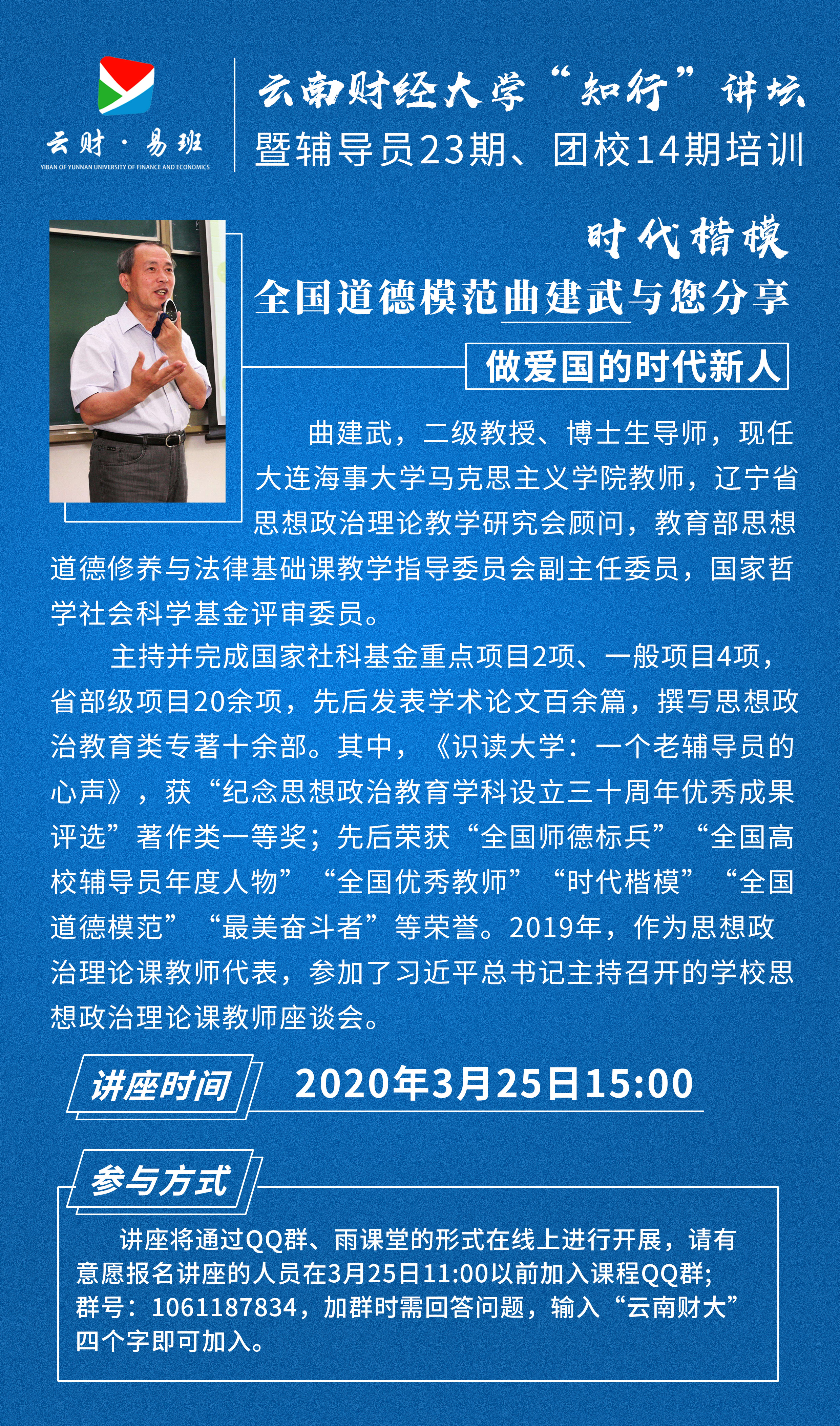 在深入开展“共抗疫情,爱国力行”主题教育活动之际,时代楷模、全国道德模范曲建武教授将于3月25日做客WilliamHill官网“知行讲坛”,通过在线讲座的方式帮助云财学子进一步坚定理想信念、树立崇高人生理想、学会珍惜青春时光、求得真才实学,同时结合从事辅导员以及大学生思想政治教育工作丰富的经验,为WilliamHill官网辅导员开展思想政治工作提供指导。