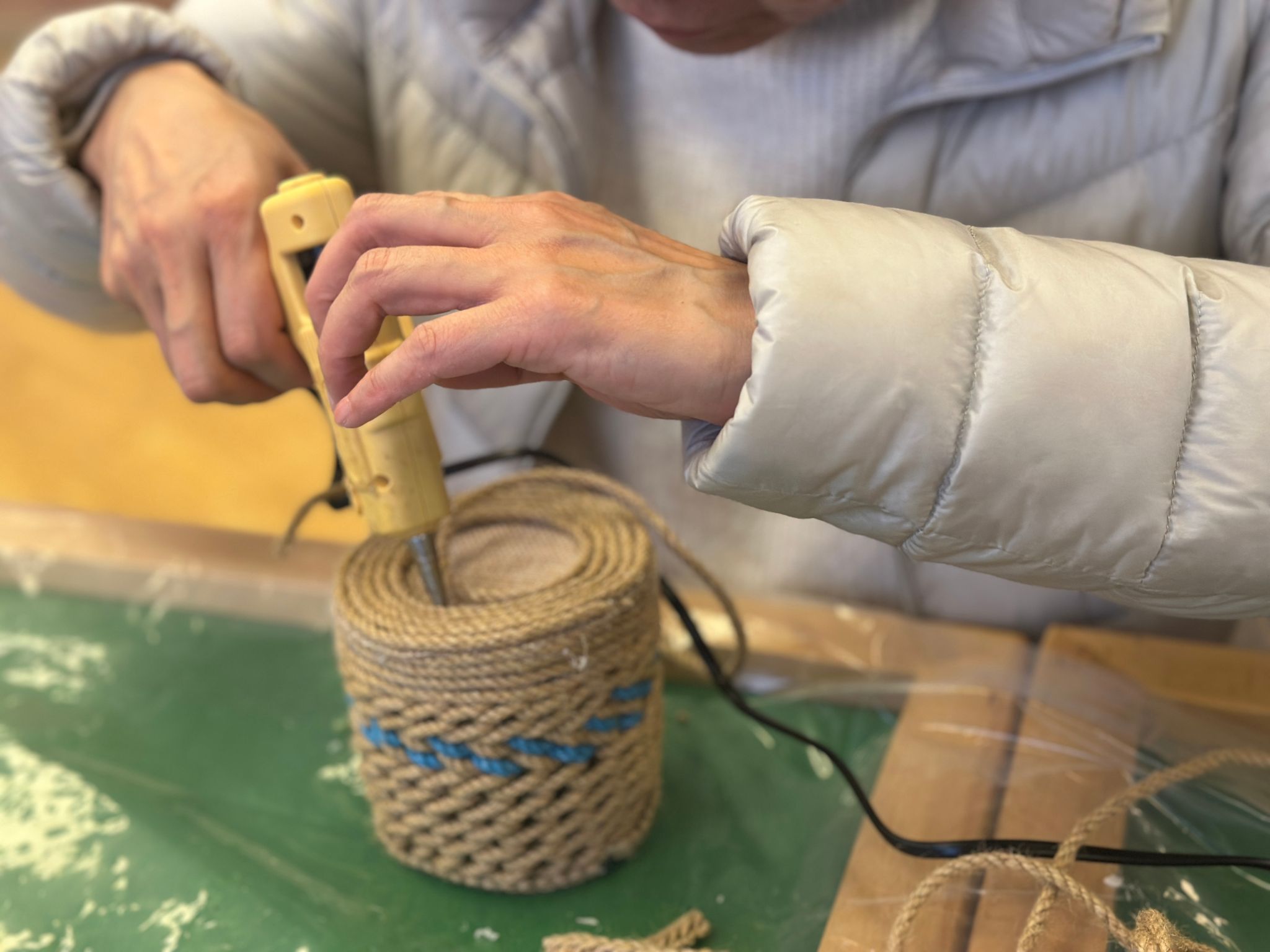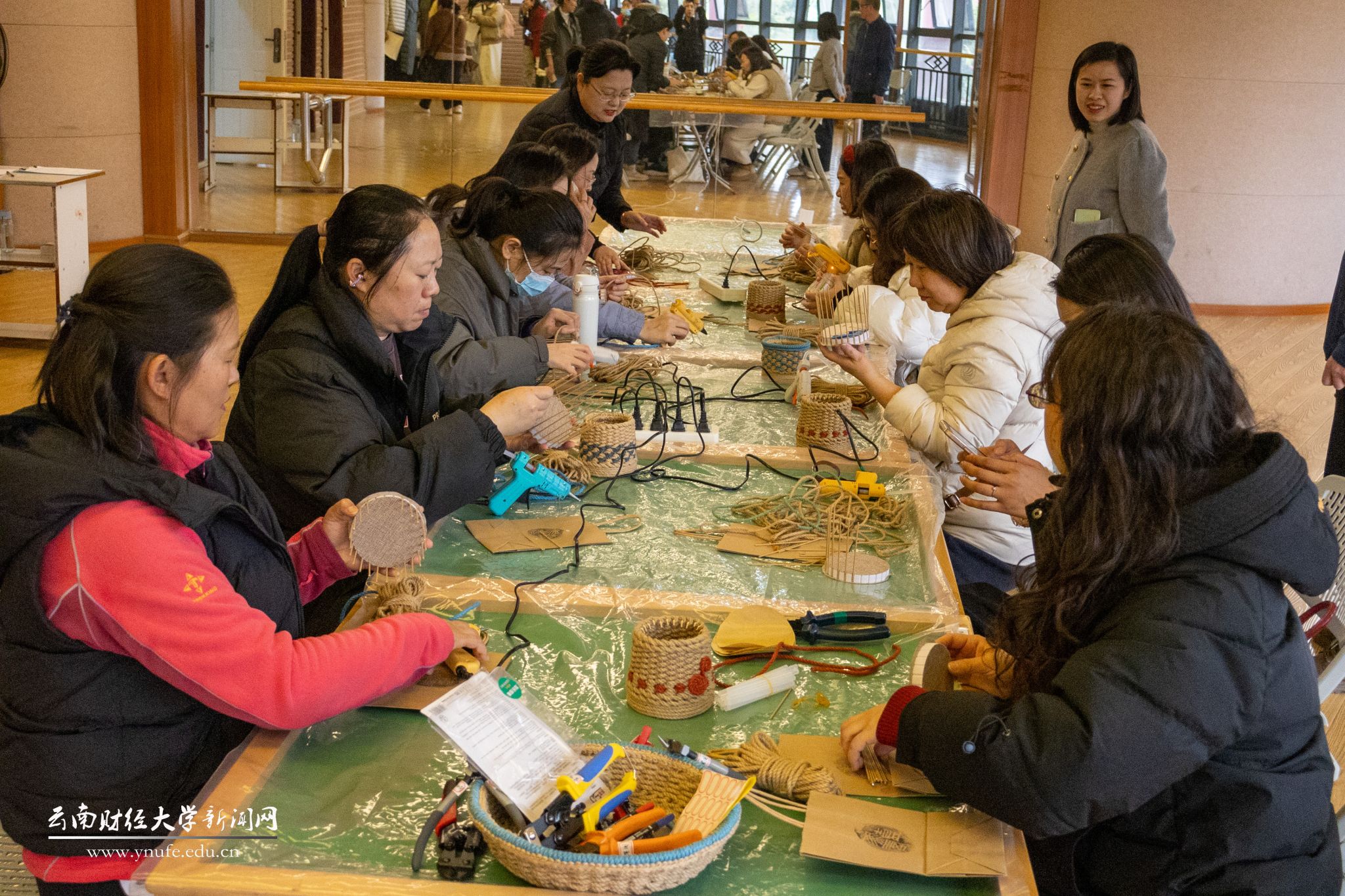 在麻绳置物篓制作区,普通的麻绳在女教职工们的巧手中变成一个个兼具实用功能与审美价值的收纳小物。现场笑声不断,暖意融融,仿佛连空气都染上了手作的温柔气息。