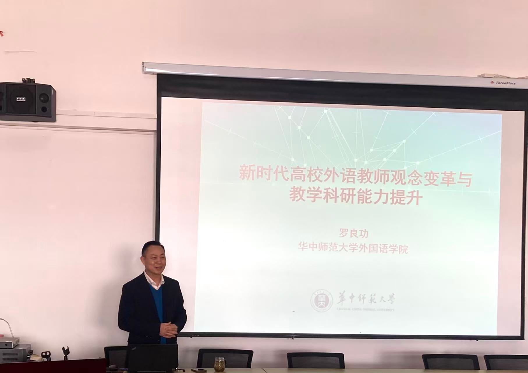 12月27日,华中师范大学外国语学院院长罗良功教授应邀为国际语言文化学院师生作题为“新时代高校外语教师的观念变革与教学科研能力提升”的学术讲座。讲座由学院院长刘代容教授主持。