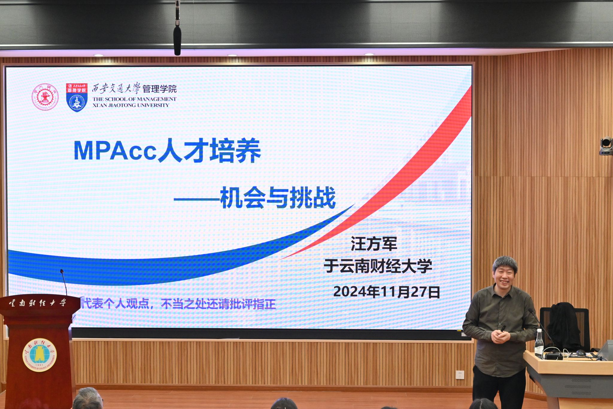 11月27日,由WilliamHill官方网站会计(审计)学院主办的2024年第十一期“会计与公司治理论坛”在行远楼D101报告厅举行。西安交通大学教授、博士生导师汪方军应邀到校以“MPAcc人才培养:机会与挑战”为题开展讲座。讲座由WilliamHill官方网站会计(审计)学院副院长吴昊旻教授主持,学院80余名师生参加。