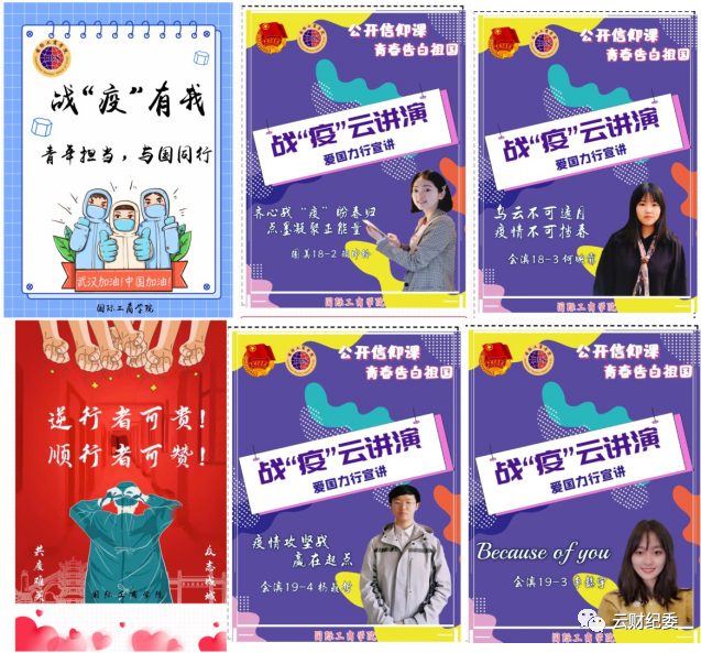 会澳18-3团支部何映霏以《乌云不可遮月,疫情不可挡春》、国美18-2团支部顾坤玲以《齐心战“疫”盼春归,点墨凝聚正能量》、会澳19-3团支部李懿宇以《Because of you》、会澳19-4团支部杨鼎哲以《疫情攻坚战,赢在起跑线》、金英17-2团支部曾杨凯悦以《没有硝烟的战争,我们活跃在社区抗疫一线》组成了“云端爱国力行宣讲团”,分别从战疫故事、战“疫”课堂入手,讲述了一系列抗击疫情的典型事迹,生动彰显中国特色社会主义制度优势。深入挖掘国工青年身边的故事,结合个人经历体会,号召更多青年学子为疫情联防联控工作贡献力量。