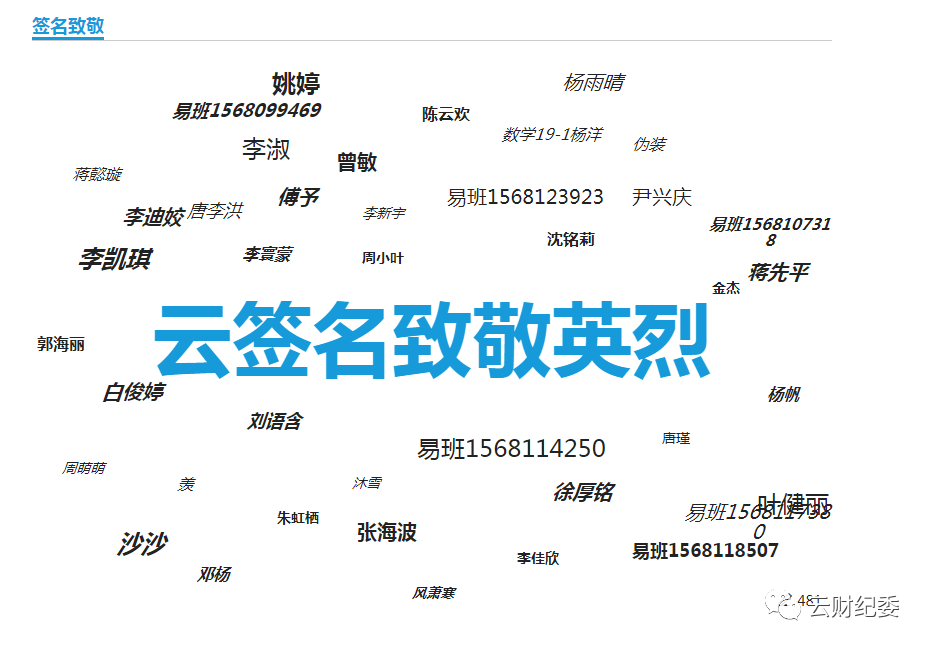 为确保活动正常进行,学院结合实际,通过QQ群、易班网先后下发通知,安排部署“致敬·2020清明祭英烈”网上祭扫英烈活动及网上云签名寄语活动。在易班网,搭建了《云财统数“清明祭英烈”云签名寄语活动》轻应用,开展云签名寄语活动。统数学子们在寄语专区写下寄语,致敬英烈。截至活动结束时,共有1124人次访问了活动轻应用,浏览量2040次,有484名同学参与了云签名致敬英烈活动,学院清明祭英烈寄语专区共收到302条寄语。