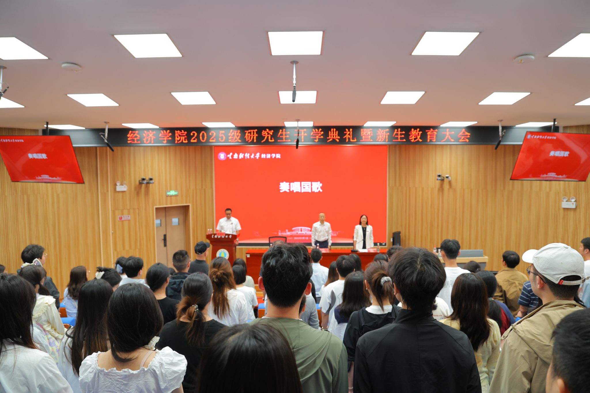 9月1日,经济学院2025级研究生开学典礼暨新生教育大会在龙泉校区行远楼D101报告厅举行,学院领导、院党委委员出席,导师代表、在校生代表、班主任、学院各科室老师及辅导员和2025级全体研究生新生参加开学典礼暨新生教育大会。开学典礼暨新生教育大会由学院党委委员、副院长江淑斌主持。大会在庄严的国歌声中拉开帷幕。全体师生精神抖擞,齐声唱响国歌,目光中饱含了不负韶华、强国有我的坚定信念。
