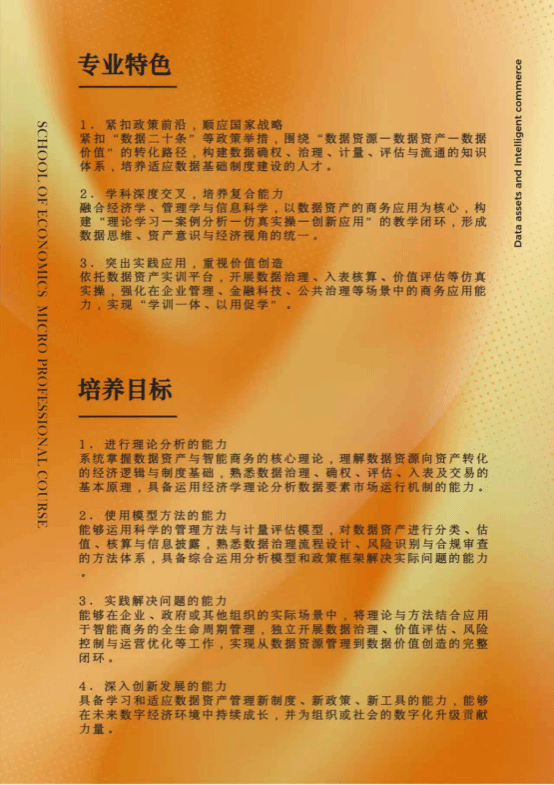 本专业突出政策性、前瞻性与应用性三大特色,既顺应国家构建数据基础制度、发展数据要素市场的总体方向,又注重培养学生在数据资产评估、数据合规管理和数据商务应用等方面的专业能力。学生经过培养能够把握数字经济发展的新机遇,在企业数字化转型、政府数据治理及数据要素市场建设中展现核心竞争力,为推动经济高质量发展和数据价值体系建设发挥关键作用。