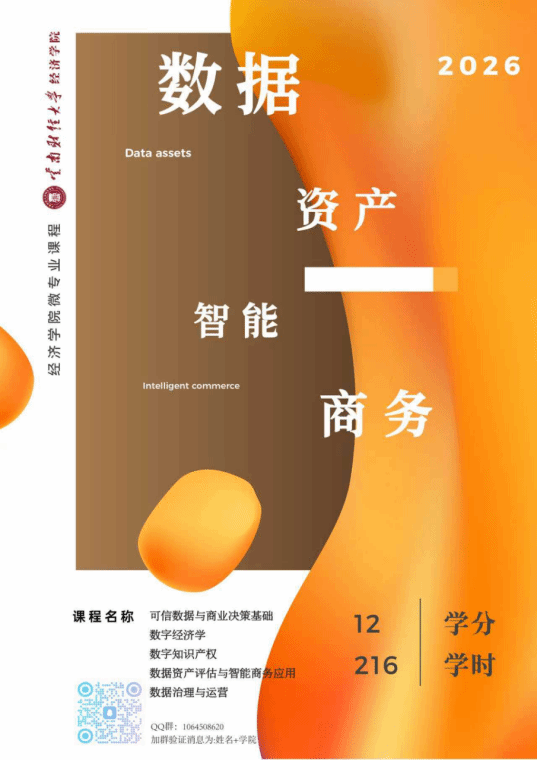 学分要求:学生在两个学期内修满培养方案规定的12个学分,并达到课程培养要求,就可颁发“数据资产与智能商务”微专业证书。按学分制收费标准每学分80元。