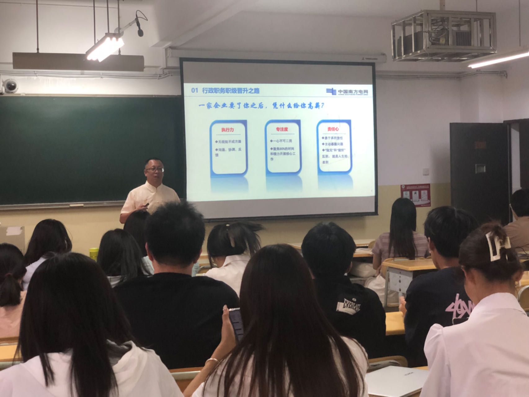 刘炎以《进入职场,你准备好了吗?》为主题,从企业选人用人的角度对职场新人如何实现行政职务职级晋升、专业技术技能晋升,职场核心能力和素养等问题进行讲解,鼓励学生不断提升工作的执行力、专注度和责任心,积极主动、脚踏实地做好工作。