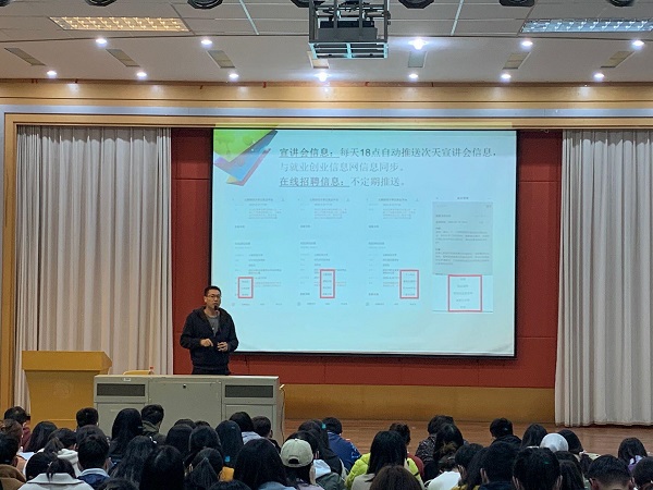 张志超老师向大家详细介绍了云就业系统的主要版块、网上签约流程、网上生涯规划测评、生源信息统计、三方协议发起及推荐表的填写等多项重要内容,并强调了报到证的重要性。