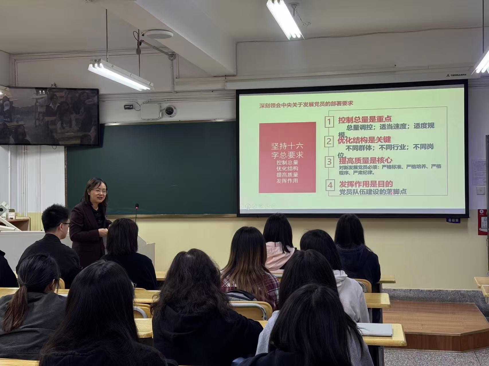 杨雯从深刻领会中央关于发展党员的部署要求端正入党动机以实际行动争取早日入党、对入党积极分子的要求、党校培训期间的要求、如何撰写思想汇报等六个方面做了讲解。杨雯强调,入党积极分子要加强理论学习,提高政治素养,并把学习成果贯彻到行动中;要发挥模范带头作用 ,刻苦学习、团结同学、关心集体、乐于奉献,努力做学校“三风”建设的践行者和先行者。杨雯指出,学院在发展党员过程中,严格标准、严格培养、严格程序、严肃纪律,着力提高发展质量。把综合素质作为发展学生党员的重要考察内容,全面考察思想政治、能力素质、道德品行、现实表现等方面的具体标准,注重学生的一贯表现和关键时刻表现、自我评价和群众评议、学习情况和社会实践情况,防止把学习成绩作为考察党员的唯一条件。
