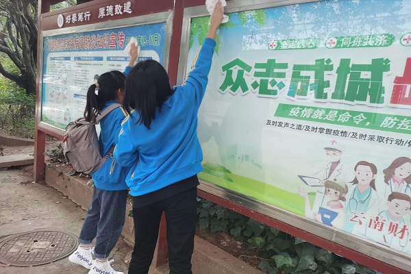 微风帮勤劳的志愿者们带走汗滴,煦日为无私的志愿者们送来温暖。10月13日下午4时,身着蓝色院衫志愿者们拿着抹布、铲子等清洁工具在毓新楼门前集合。活动过程中,每位志愿者各司其职,撕去广告牌上的小广告,用湿抹布清洗广告牌上的脏污,并用钳子、扫把将广告牌附近的垃圾清理干净。阳光透过云层照射着大地,志愿者们的身影留在了广告牌上,所有的努力、汗水在这一刻放射光芒。清理结束后,志愿者们带走清理工具,此次活动圆满结束。
