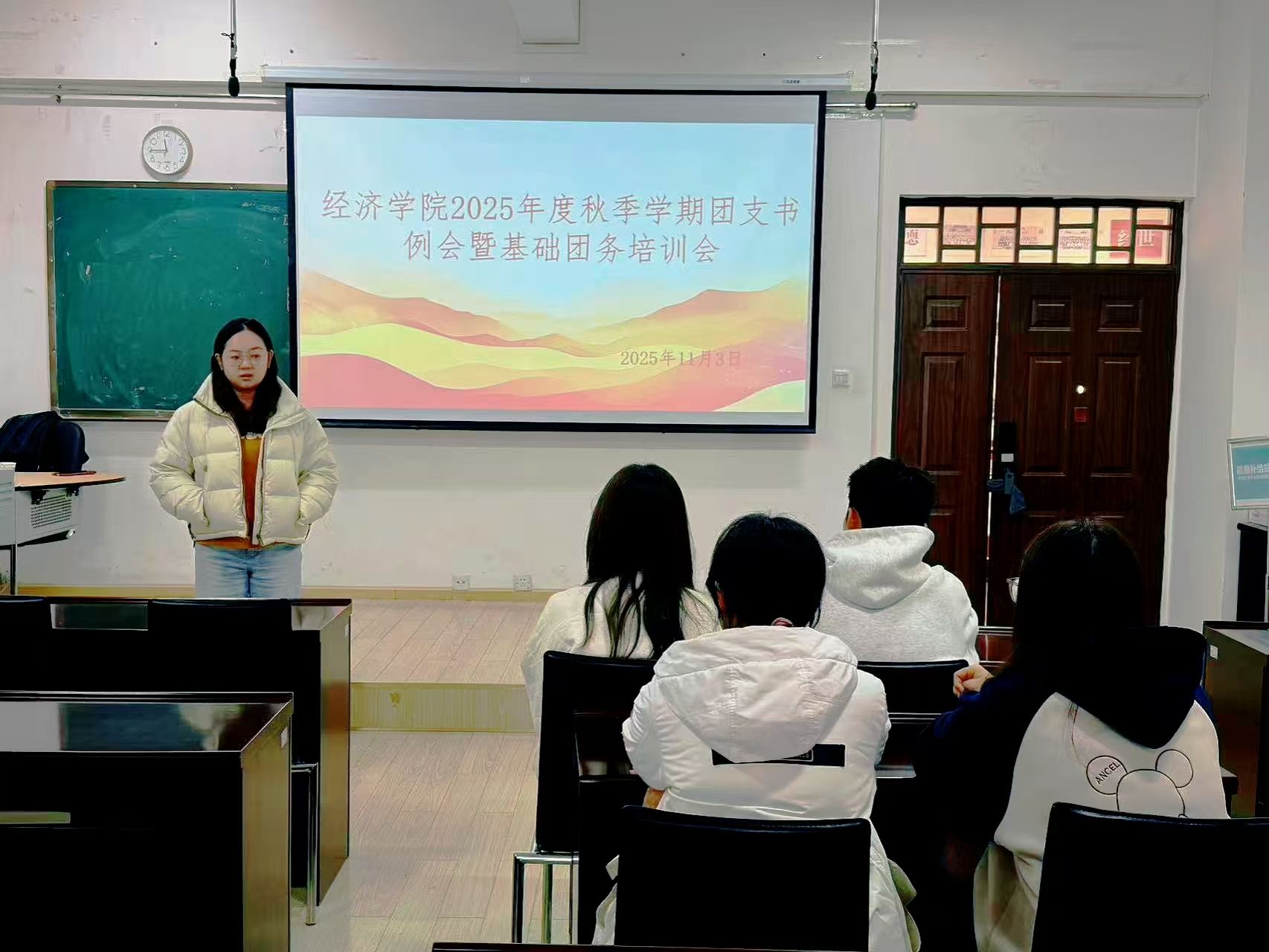 2025年10月17日,经济学院团委在博远楼203举2025年度秋季学期团支书例会暨基础团务培训会。本次培训聚焦思想引领、经验分享与业务实操三大板块,培训会由团委负责人幸莹主持,院团委学生骨干代表以及各班团支书共同参与。