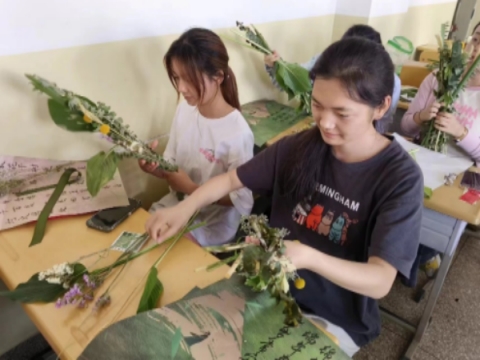 图为:同学们制作艾草花束