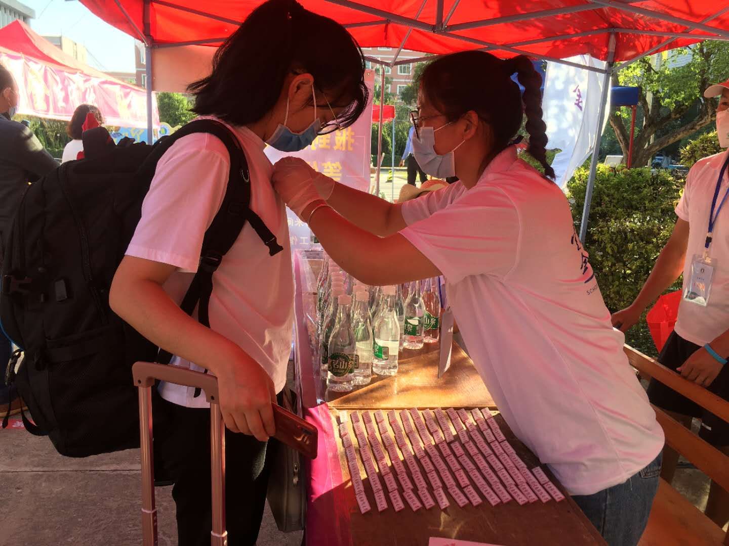 为了保证同学们顺利完成返校入学工作,熊德平院长、张建友书记、汪薇萍副书记及各科室的老师自5月13日就参与到迎接返校学生的工作中,与全体志愿者一起坚守到15号非毕业班本科生归来。夏日炎炎,酷暑难耐,为此,学院贴心的为全体志愿者准备了小风扇。学院工作点上,老师及志愿者们为同学们进行行李消毒、体温检测、健康核查、身份核验、维持秩序并亲自为同学们佩戴校徽。学院老师及志愿者们温馨高效的一举一动,不仅为同学们的安全筑起了一道健康防线,而且让返校学子们感受到了学院的温暖。
