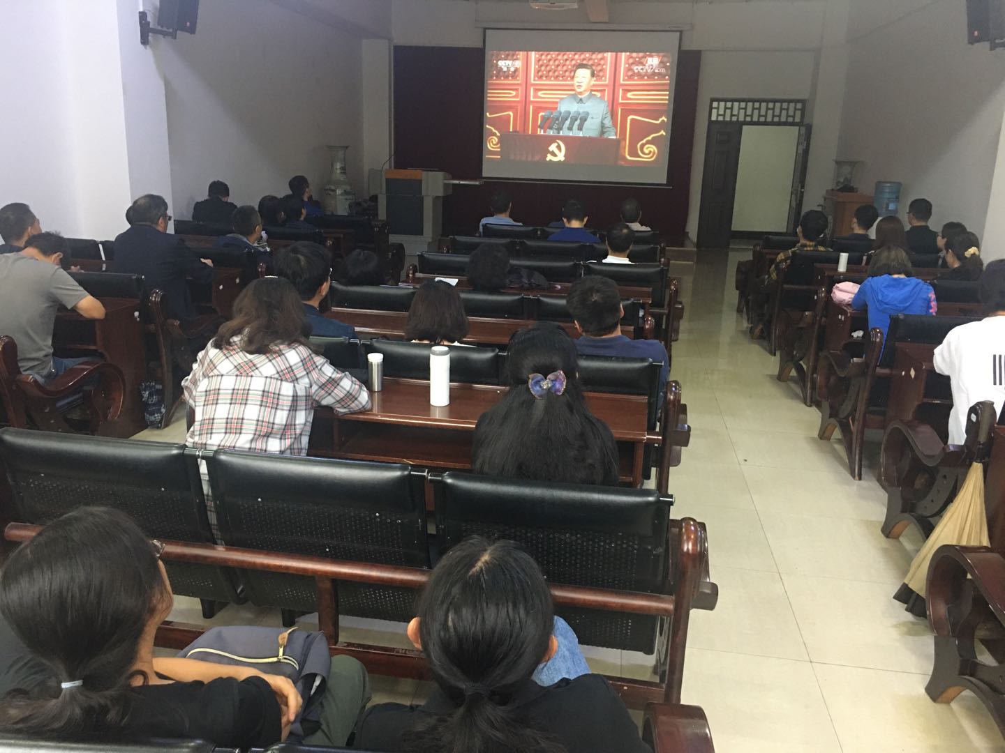 7月1日,上午8时,学院广大教师党员干部齐聚博远楼103会议室收听收看党中央庆祝中国共产党成立100周年大会盛况和习近平总书记的重要讲话。学院全体学生以班级为单位,由各班班主任、辅导员组织自行进行观看学习。许多党员边收听收看边记笔记。期间,会议室内也和天安门广场一样,不时响起令人振奋的热烈掌声。
