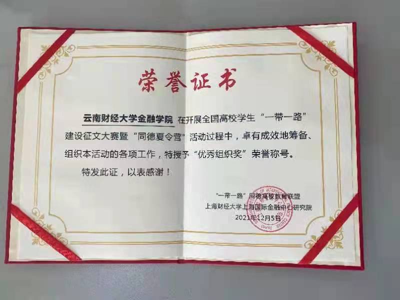 据悉我院共有48名同学的论文符合2021年(第七届)“一带一路”建设全国高校学生征文要求,经组委会组织专家初审,初评和复评后获得研究生组优秀论文一等奖1项,三等奖1项,优秀奖4项,学院连续三年获得最佳组织奖,学院副院长周伟教授获优秀个人奖。