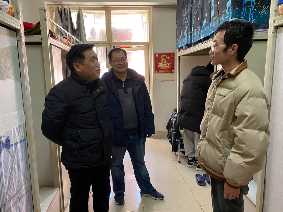 熊德平与留校学生亲切交流,了解同学们的学习和生活情况,叮嘱同学们要珍惜时间,合理规划和安排假期生活;留校住宿期间要遵守校纪校规,提高安全意识和疫情防控意识;有困难要及时联系班主任、辅导员,学院会第一时间给予帮助与支持。同时,祝福同学们度过一个温暖、幸福、充实的春节。