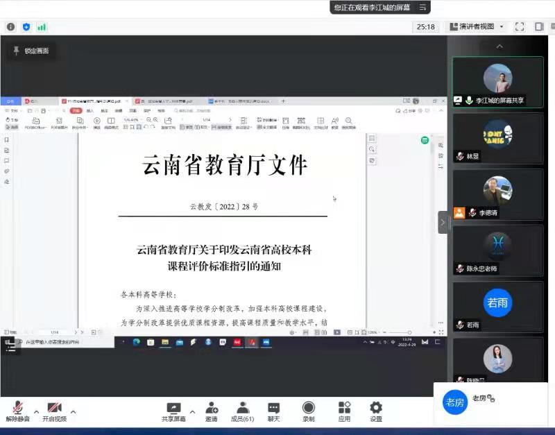 在金融学院4月29日召开的线上教职工大会上,学院李江城副院长为全体教职工解读了云南省教育厅印发的《云南省高校本科课程评价标准指引的通知》文件通知及精神。熊德平院长进行了总结,熊院长指出,该文件将为今后学院开展各级课程评价提供指引,为深入推进高等学校学分制改革,加强本科高校课程建设,提高课程质量和教学水平进行指导。