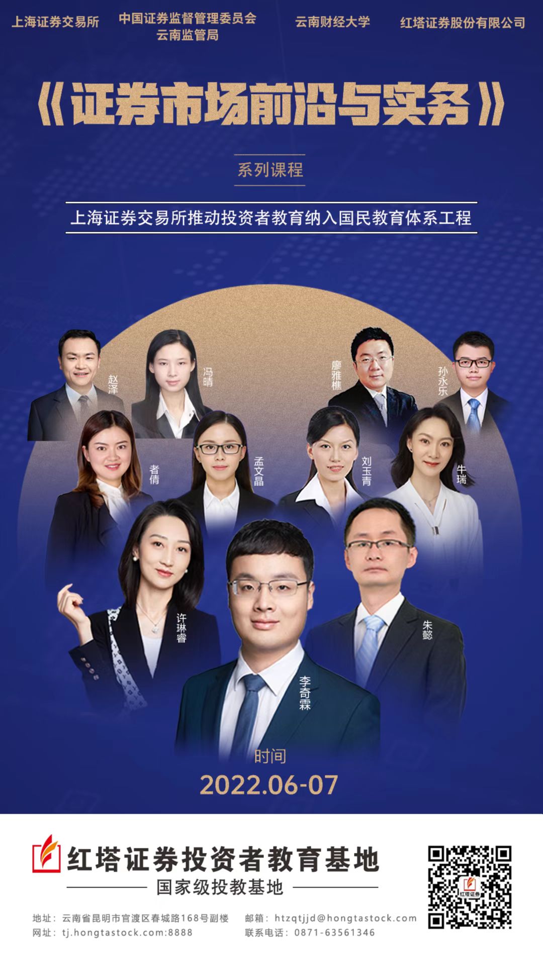 为进一步丰富学生的证券知识,开拓学生的投资视野,金融学院联合上交所、中国证监会云南监管局及红塔证券,共同开展“证券市场前沿与实务”系列讲座活动。本次系列讲座共有11场,贯穿整个夏季学期,围绕证券基础概览、证券核心业务、证券市场实务三大板块,邀请到上交所、红塔证券等十一位业内大咖前来授课,从证券市场发展历程、现状、趋势出发,再到理财规划与资产配置、债券市场改革与发展等,最后到证券市场实务,总计22个课时。本次系列讲座从实战出发,以业内名家视角梳理市场脉络,获取更多前沿信息,捕捉市场转点,加深对相关理论知识的理解,欢迎广大师生踊跃参加。具体讲座安排如下: