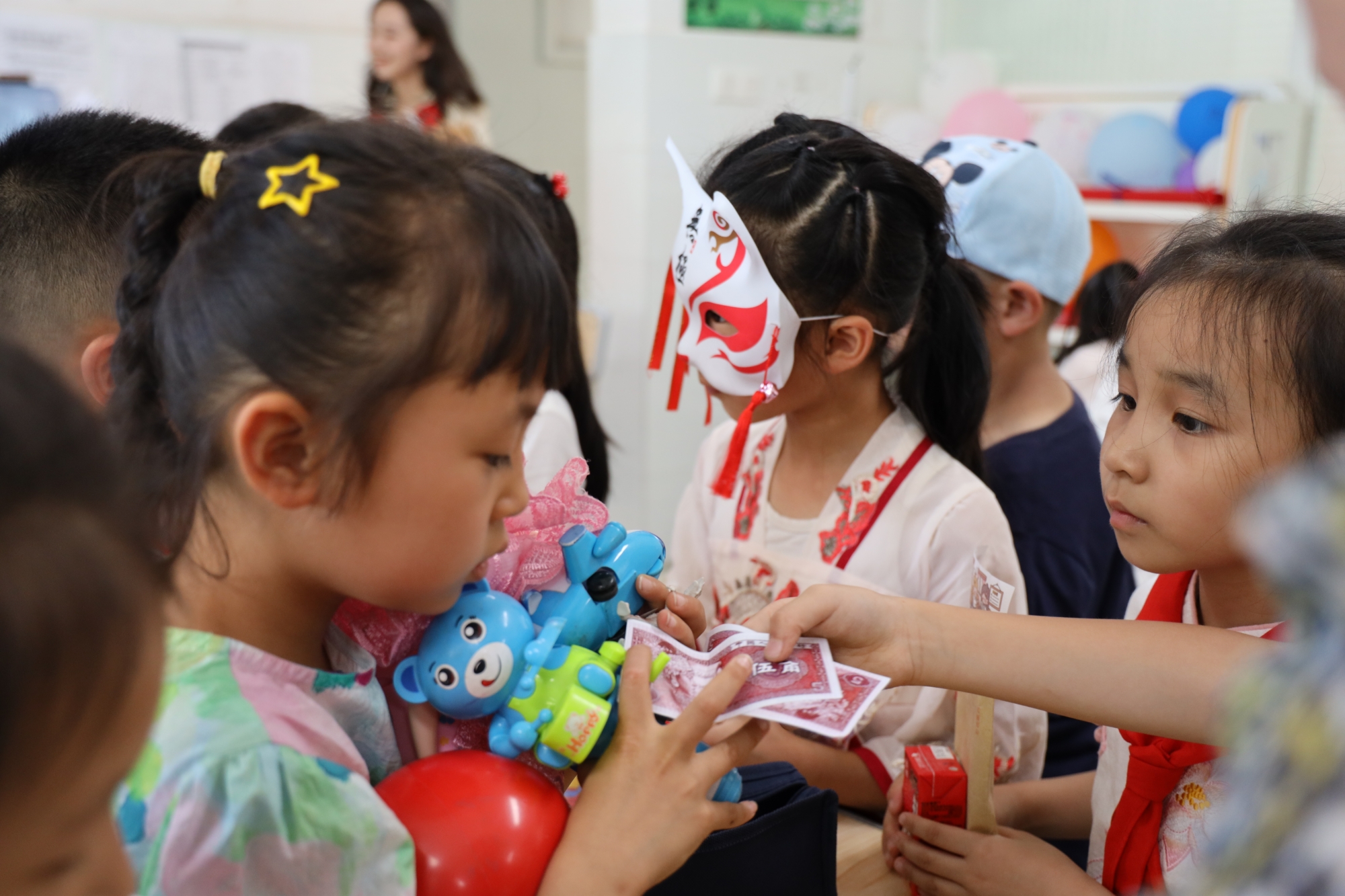 课堂以知识与实践相结合的方式开展。志愿者钱薇冰围绕着财商主题,讲述了金钱的来源、小朋友骗局识别、货币的供给与需求等金融知识。在讲述知识过后,志愿者们带领小朋友们进行“五毛一块”小游戏,游戏进行得如火如荼,小朋友们学习金融知识的热情也愈发高涨。同时设有有奖问答环节,通过抢答赢小红花的方式进行,积极参与互动抢答。课堂进入尾声,服务队的志愿者们为全班同学准备了小礼品。小朋友们乖巧地排队用赢得的小红花兑换自己喜欢的礼品,拿到礼品的小朋友们喜悦飞上眉梢,笑在脸上,甜在心中。最后进行“跳蚤”市场买卖实践,小朋友们分为商人与消费者两组进行买卖交易,让小朋友们在实践中巩固所学的金融知识。